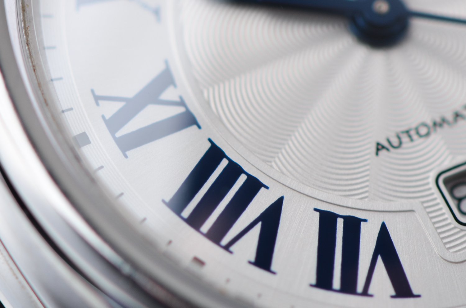 表盘:立体银白色表盘,罗马数字刻度,蓝钢指针,日历显示