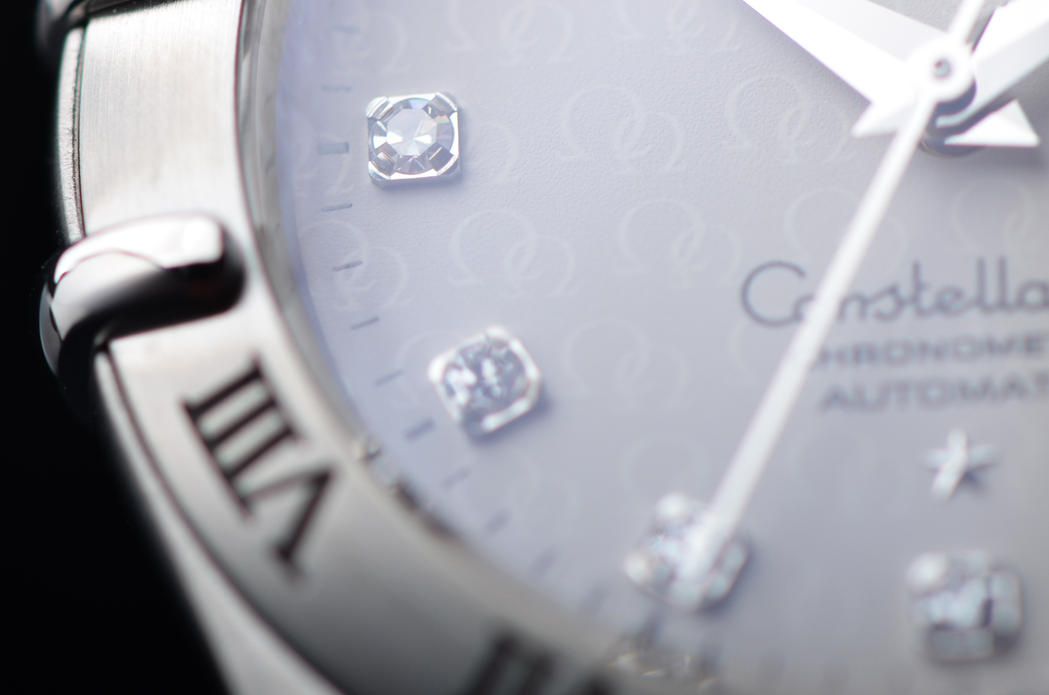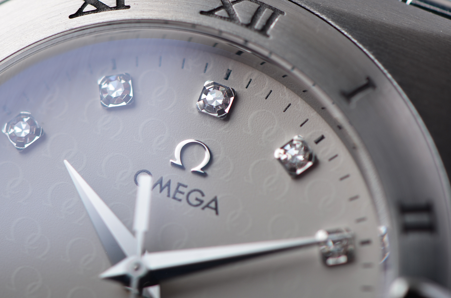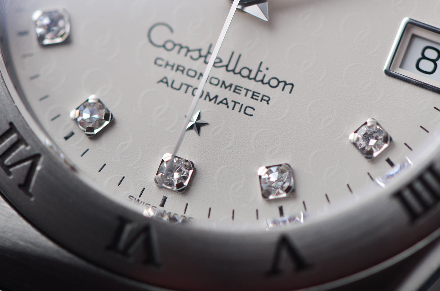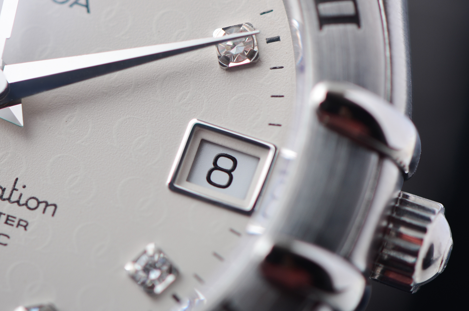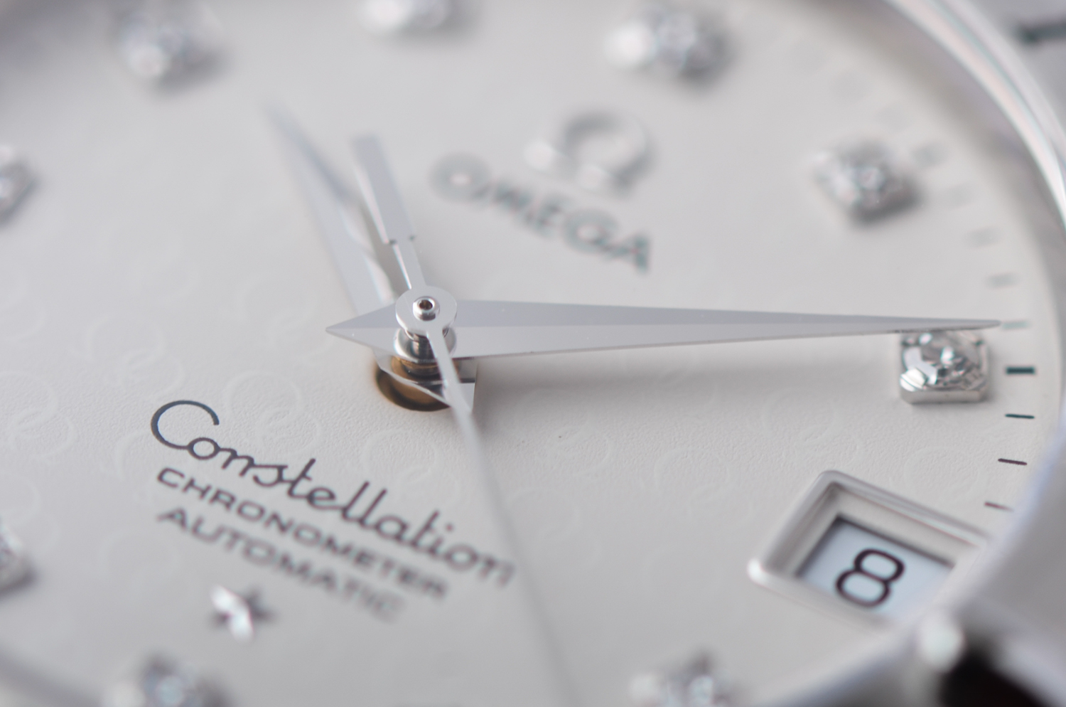 表盘:立体白色品牌LOGO暗纹表盘,11颗钻石时标