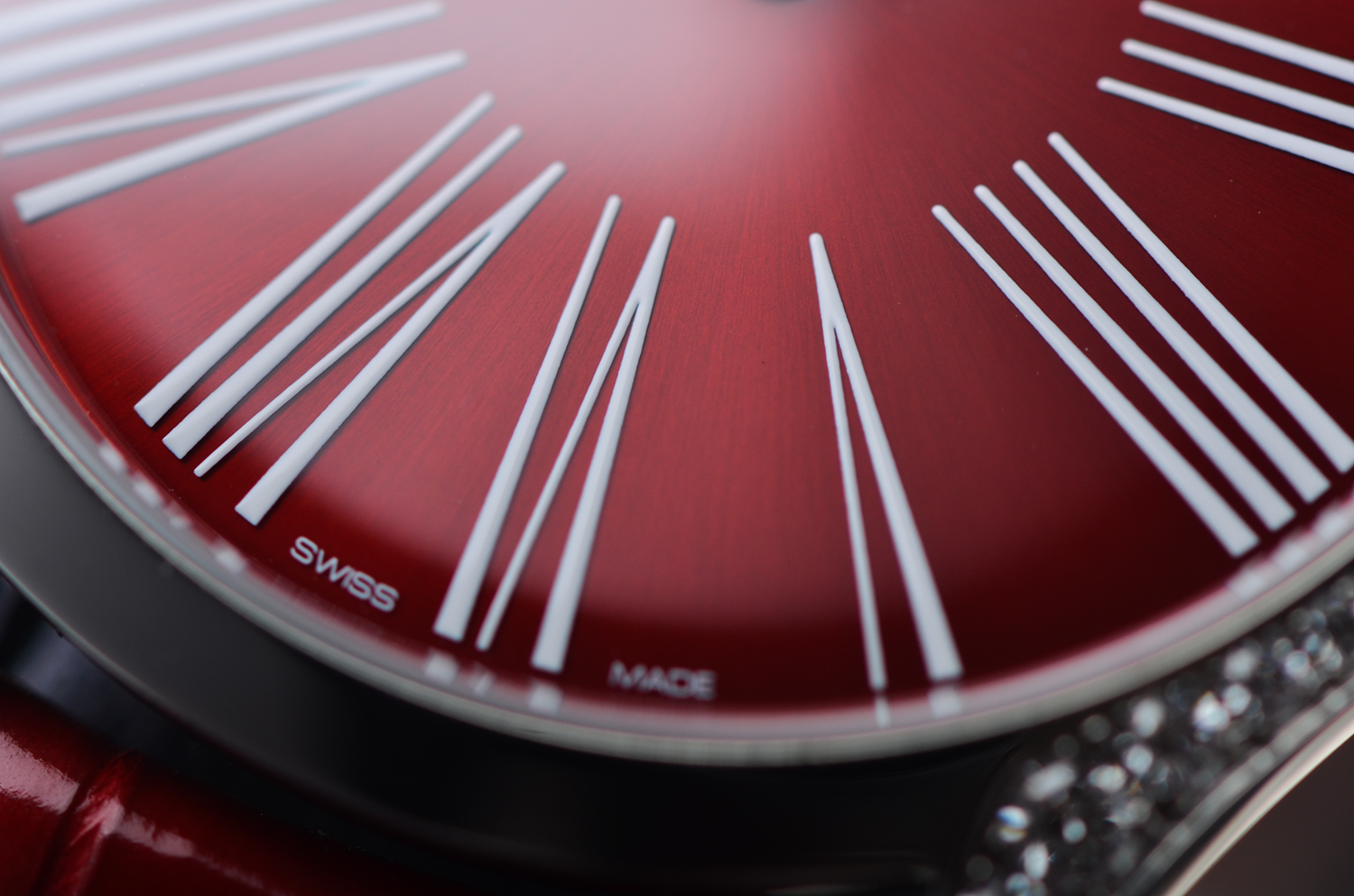 表盘:亮漆红色表盘,白色罗马数字刻度