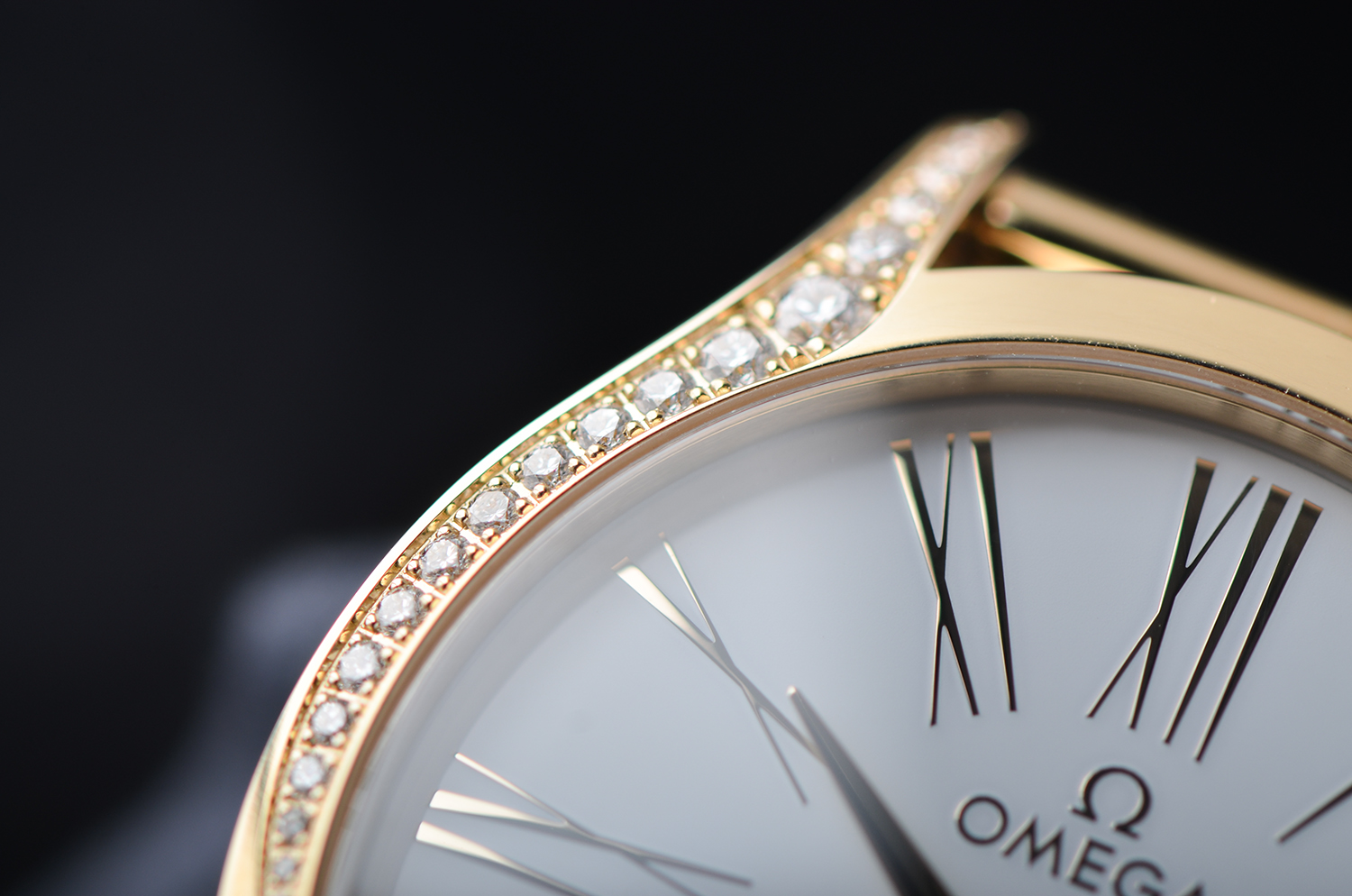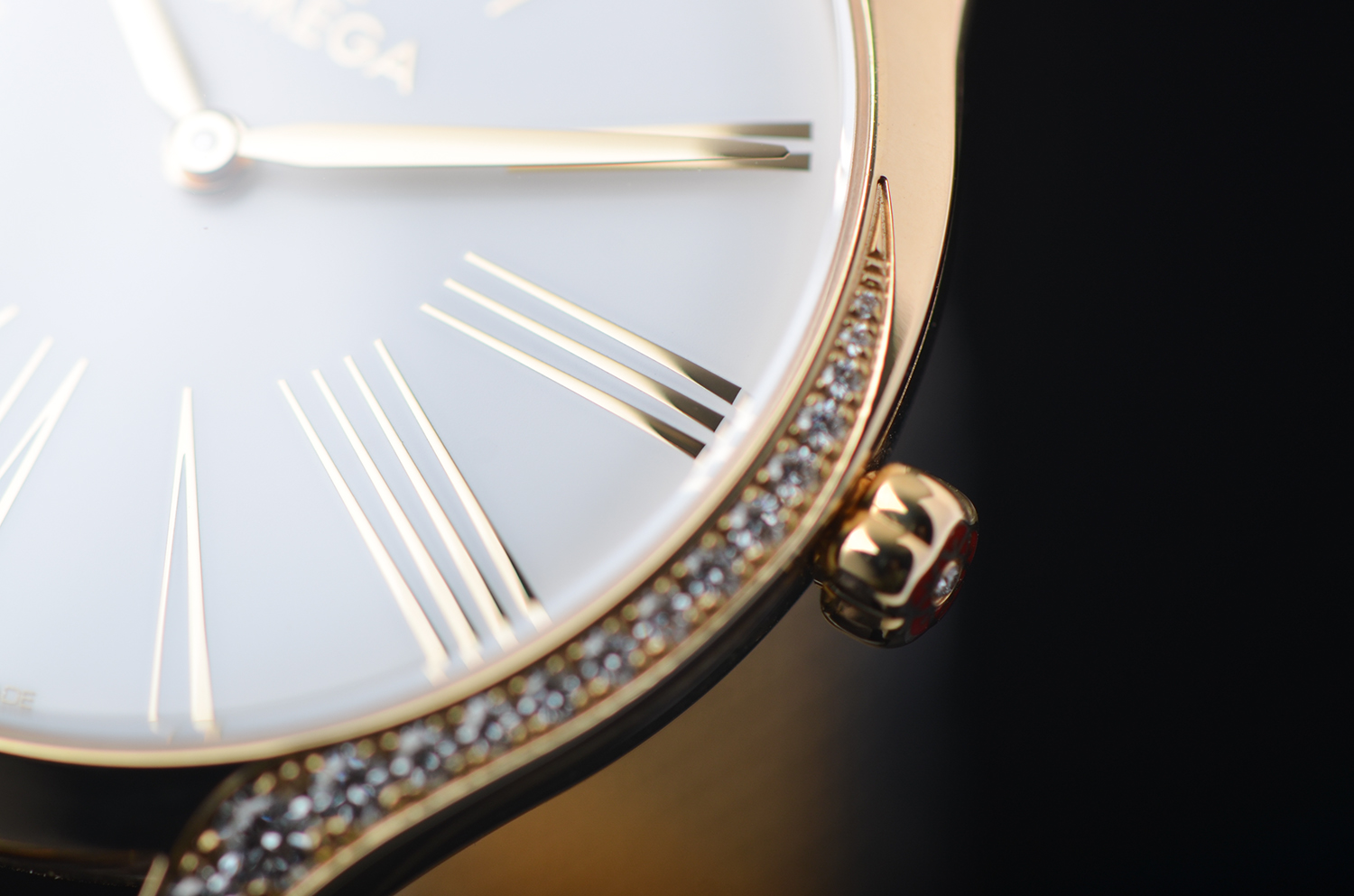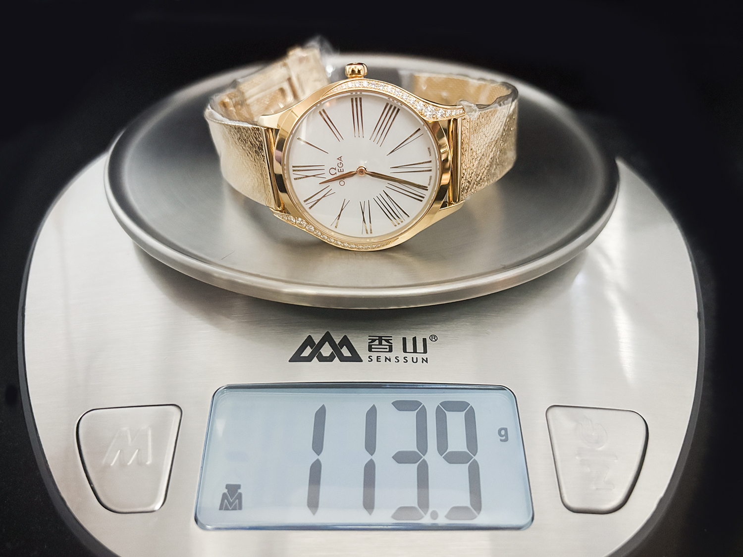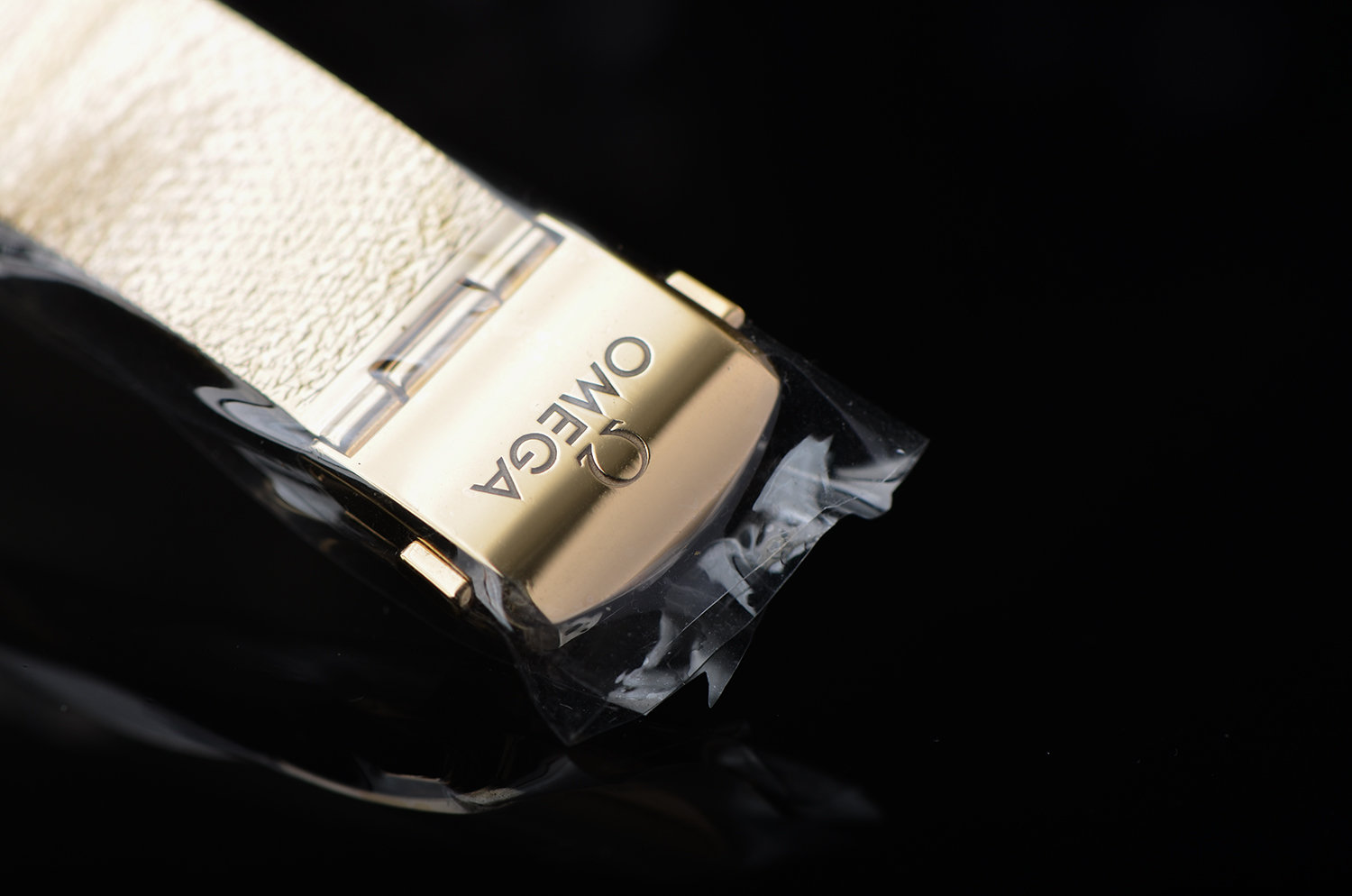 欧米茄 De Ville Trésor 428.55.36.60.04.001,采用 Moonshine 18K金编织表链 + 表壳两侧钻石点缀,在低调中彰显非凡格调。