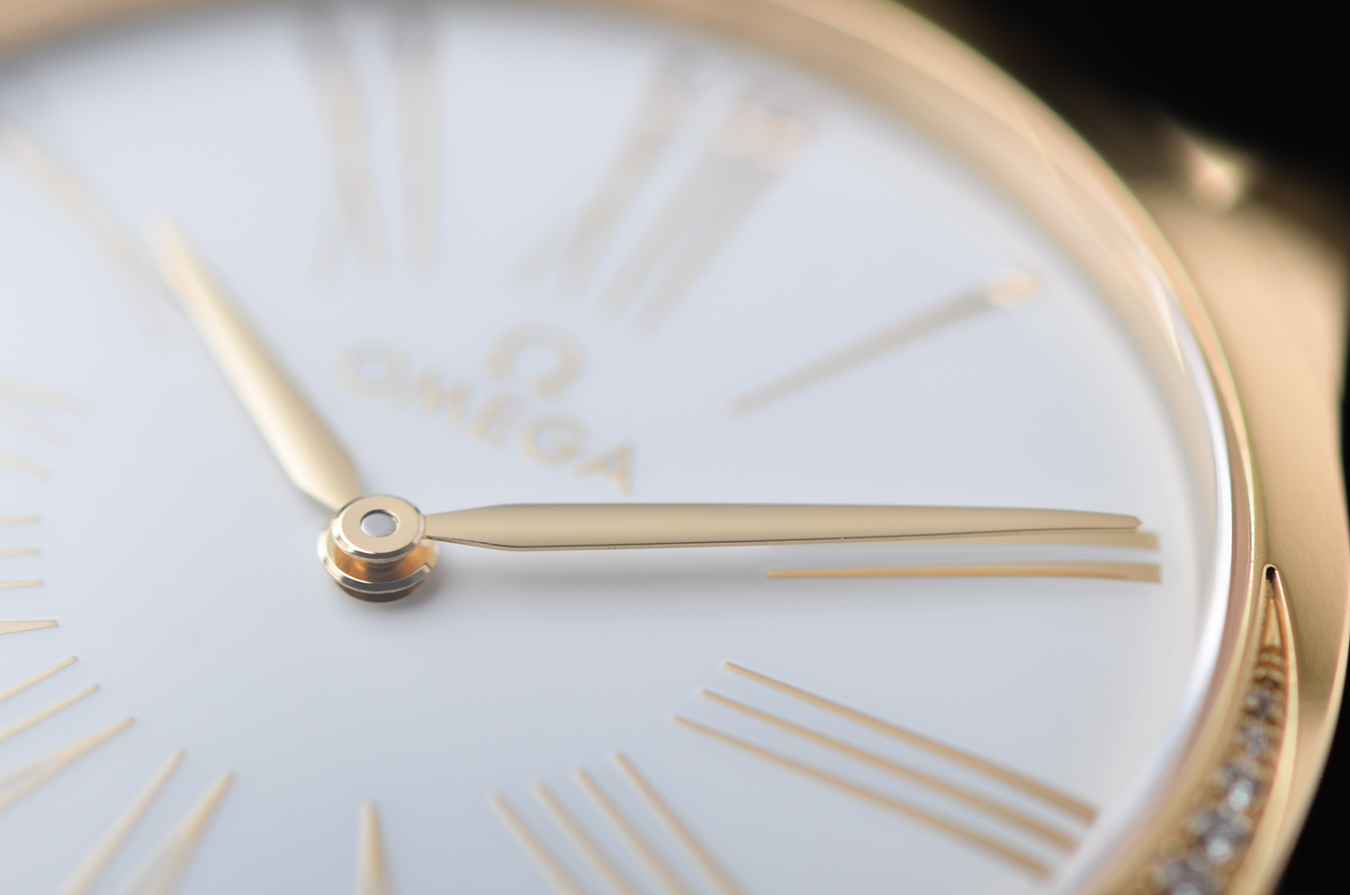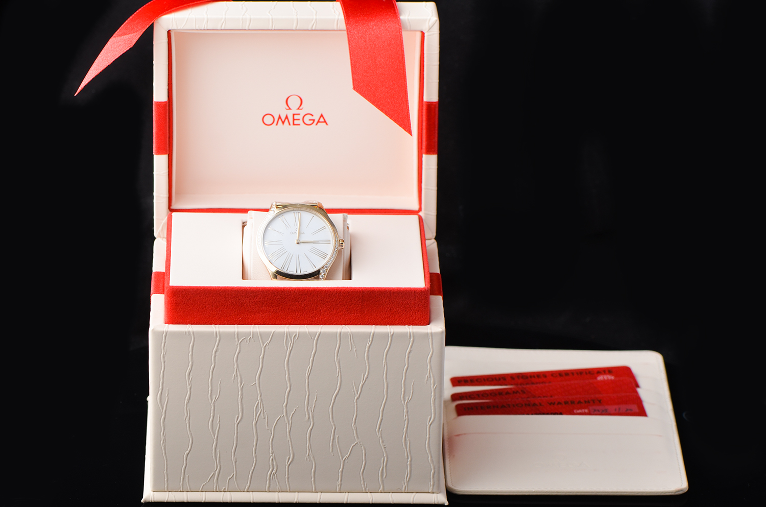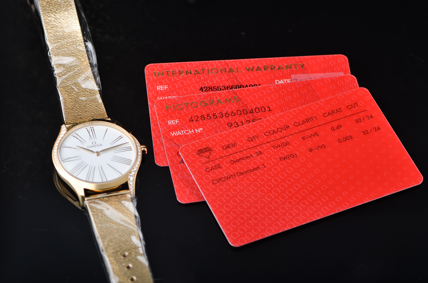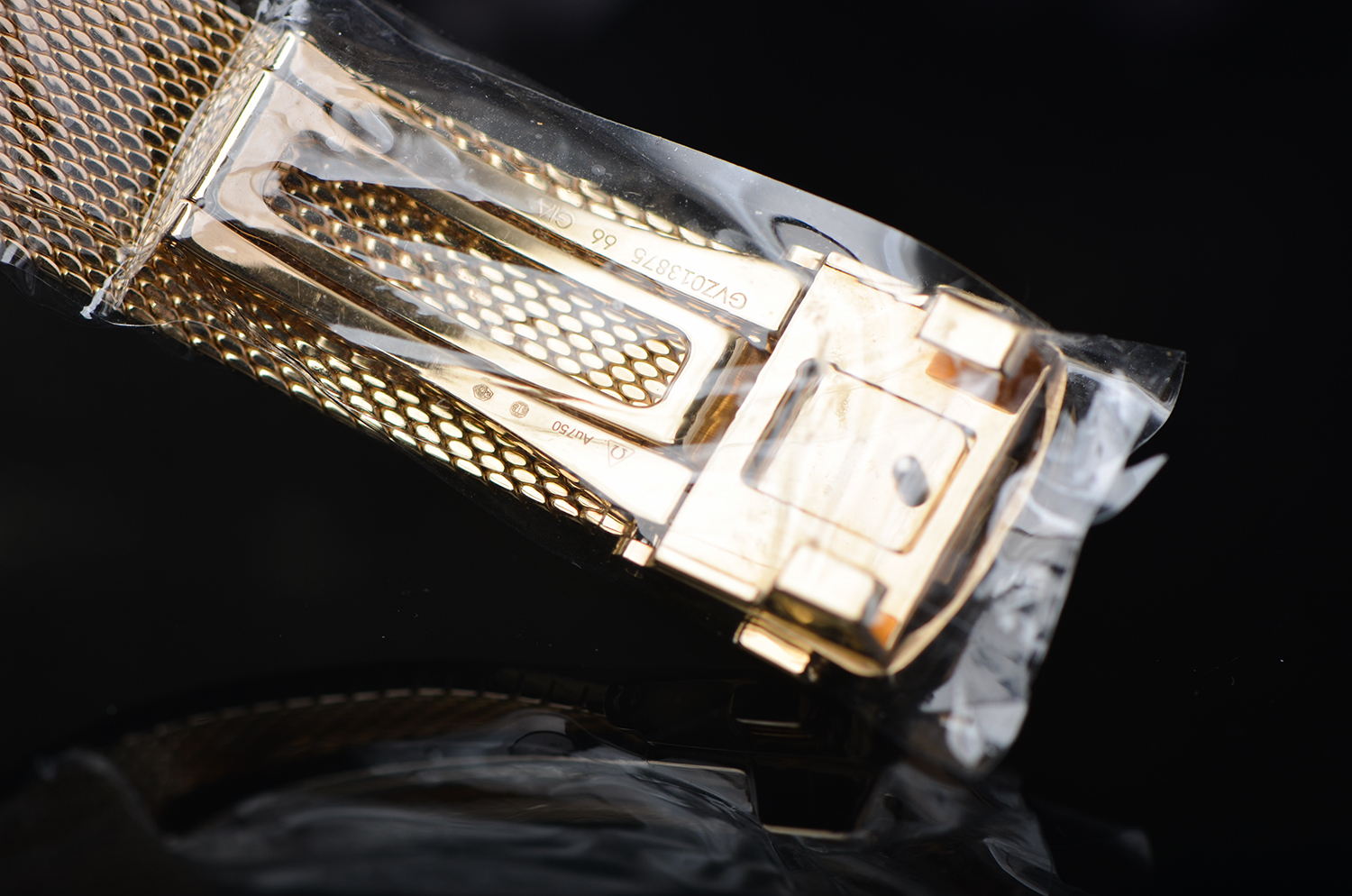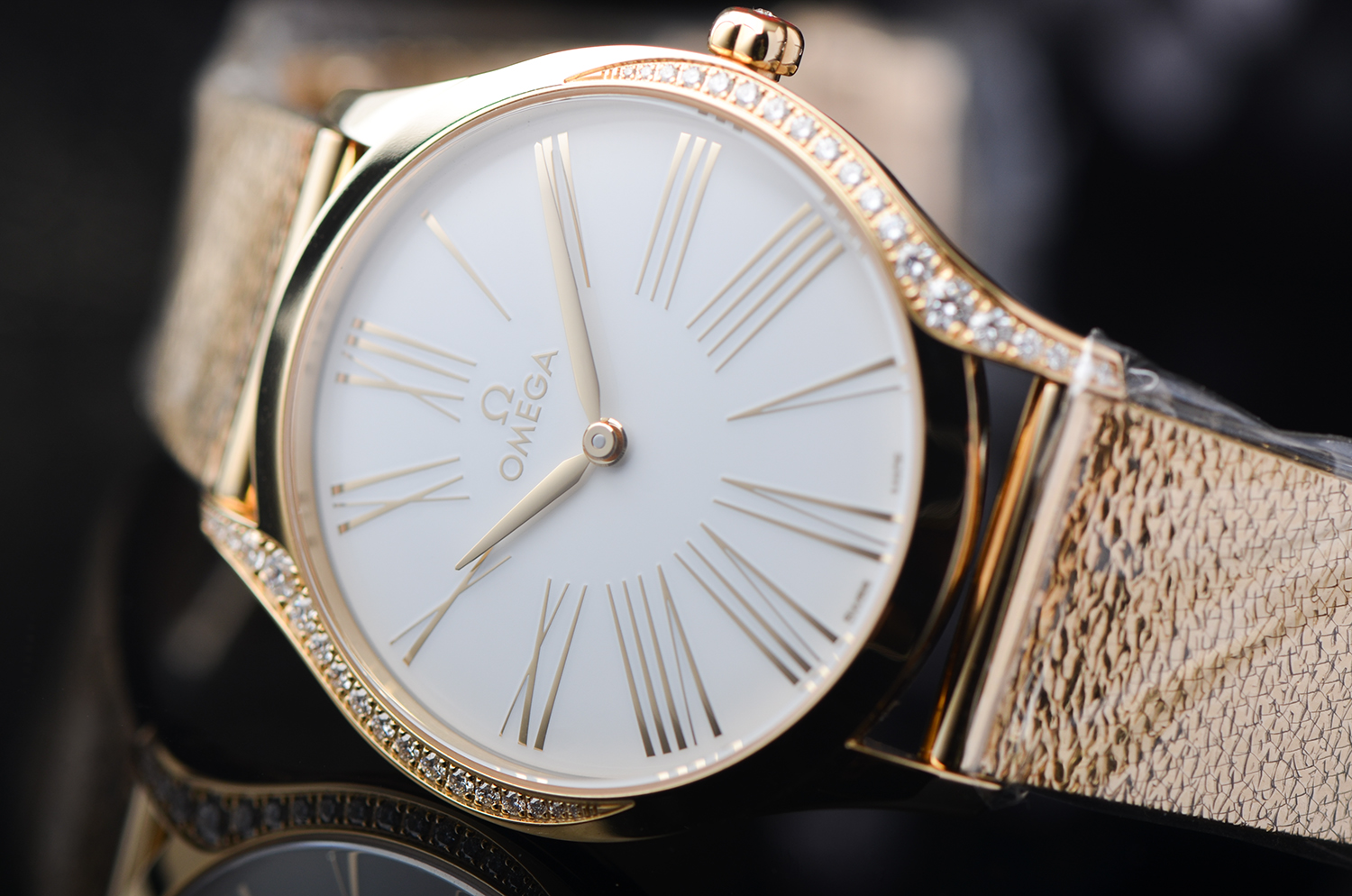 欧米茄 De Ville Trésor 428.55.36.60.04.001,采用 Moonshine 18K金编织表链 + 表壳两侧钻石点缀,在低调中彰显非凡格调。