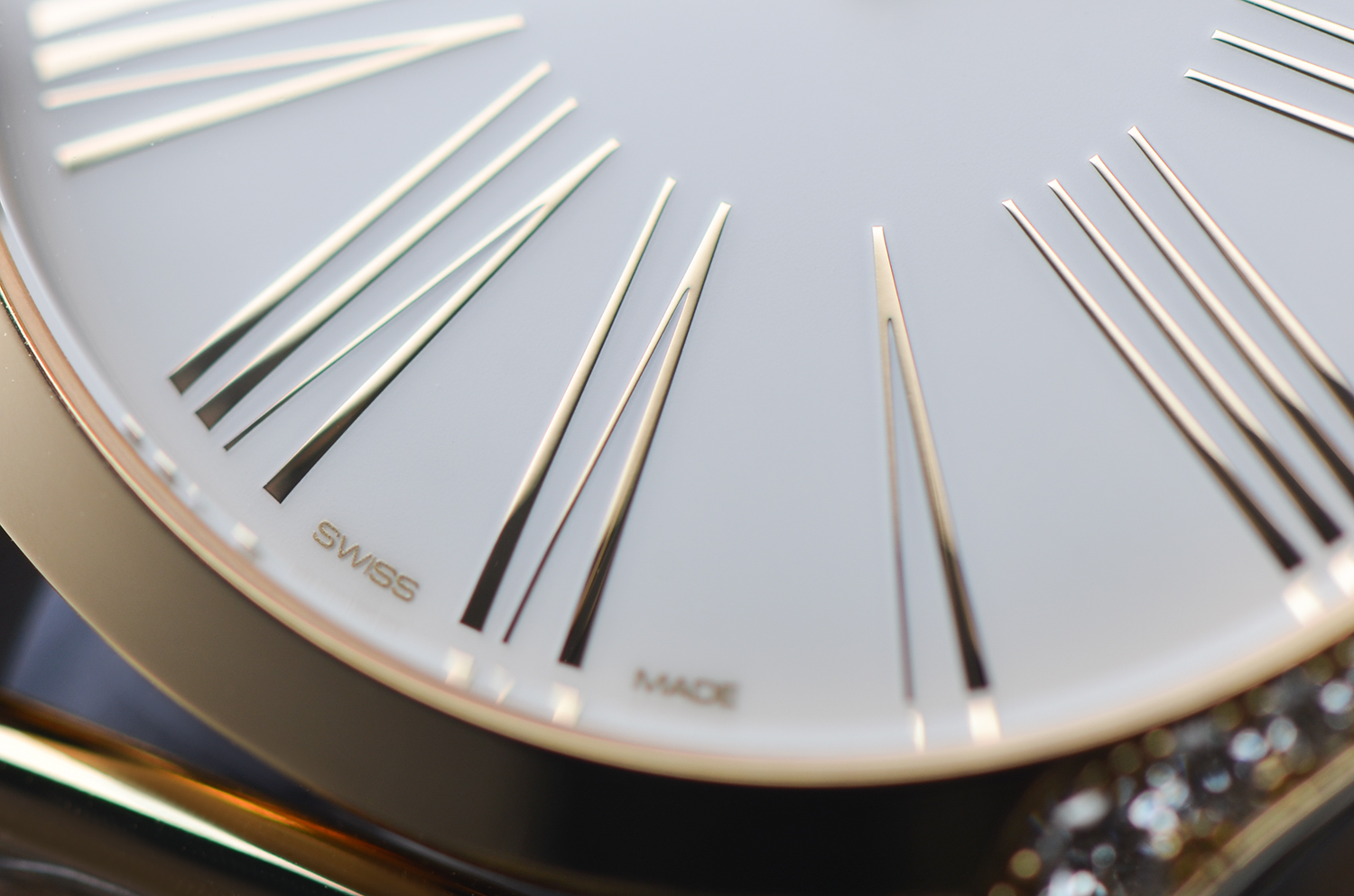 表壳两侧镶嵌 38 颗钻石,细腻排列沿曲线延展,散发温柔光彩。