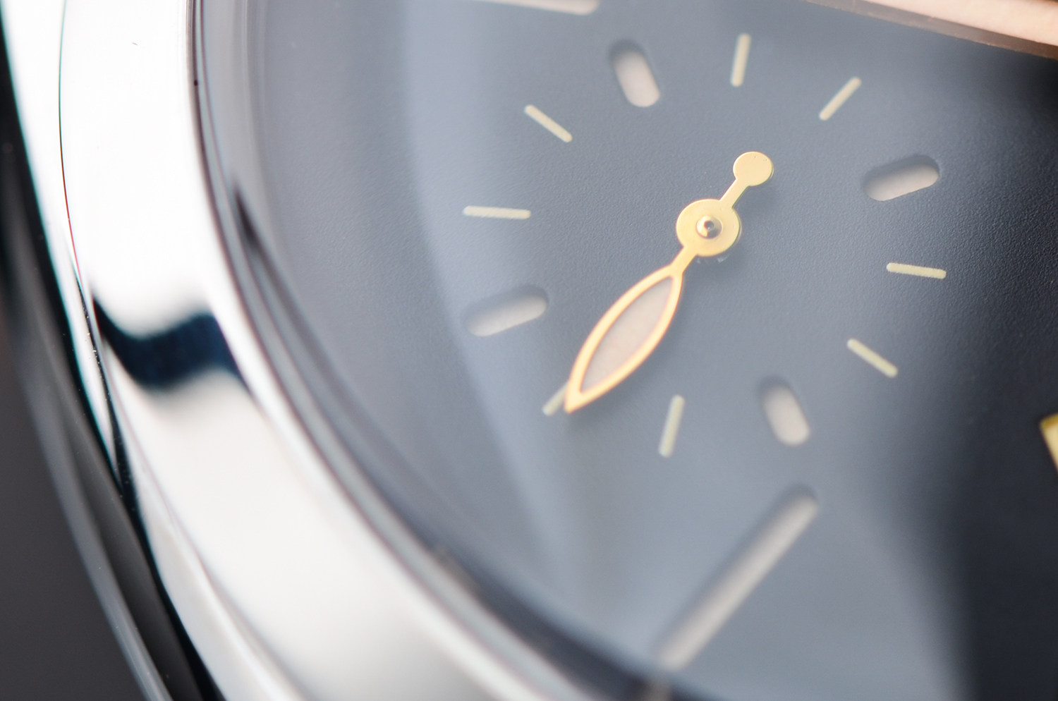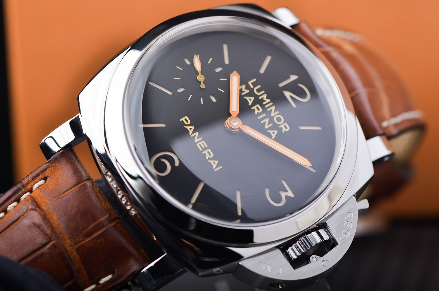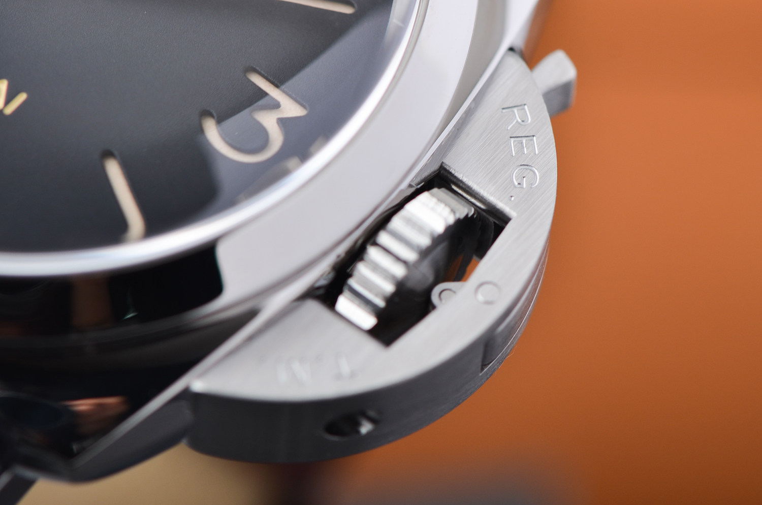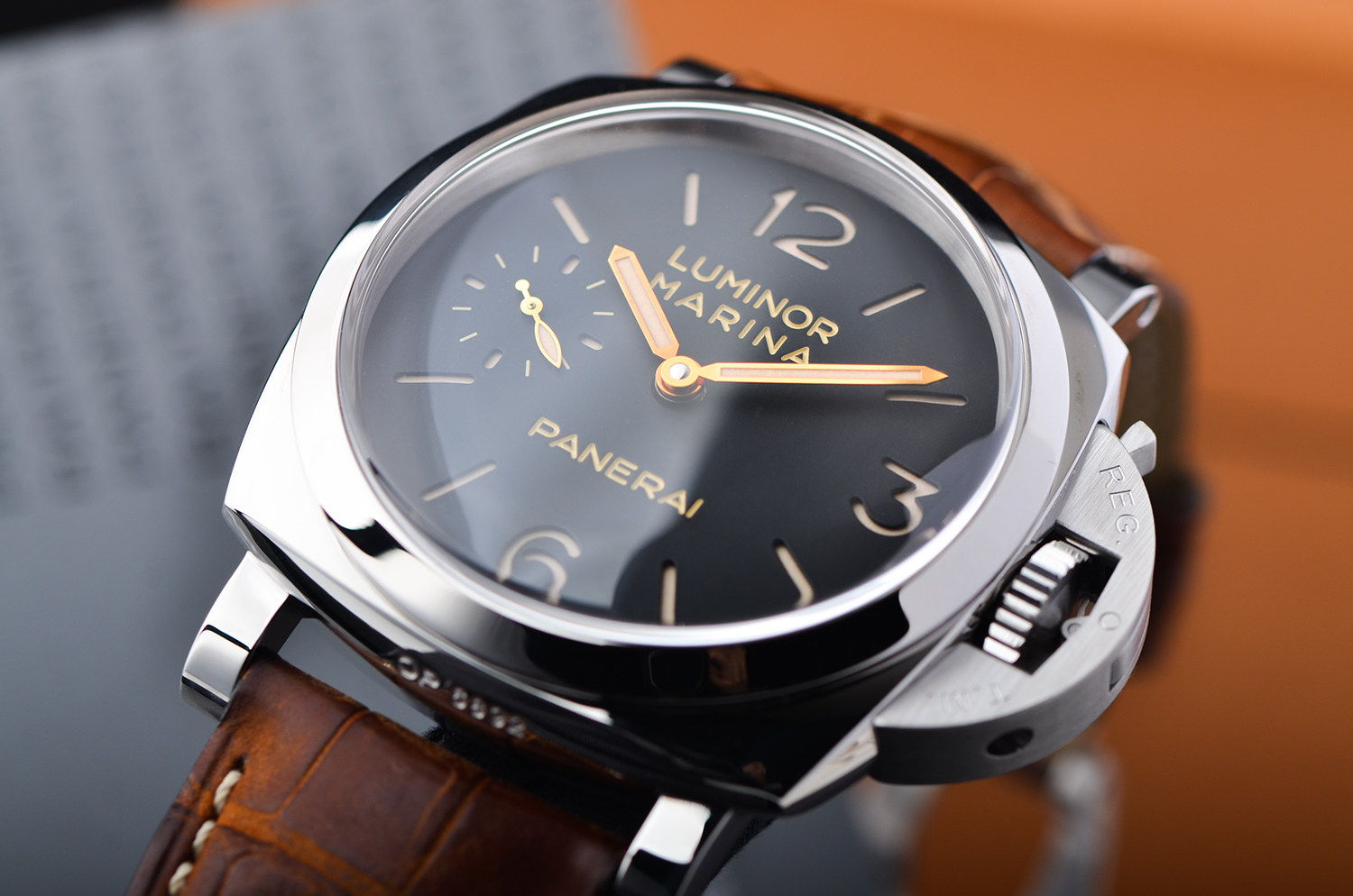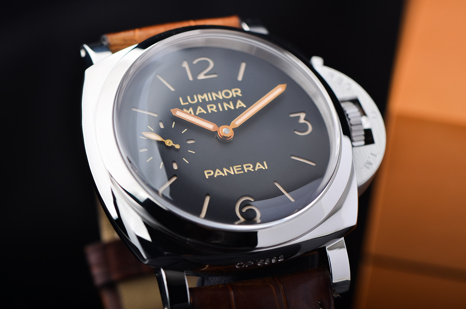 47毫米精钢表壳,线条饱满而阳刚;标志性的表冠护桥装置,彰显沛纳海独有的身份印记。黑色三明治表盘层次分明,米黄色夜光时标与指针在低光环境中依然清晰锐利,复古味十足。