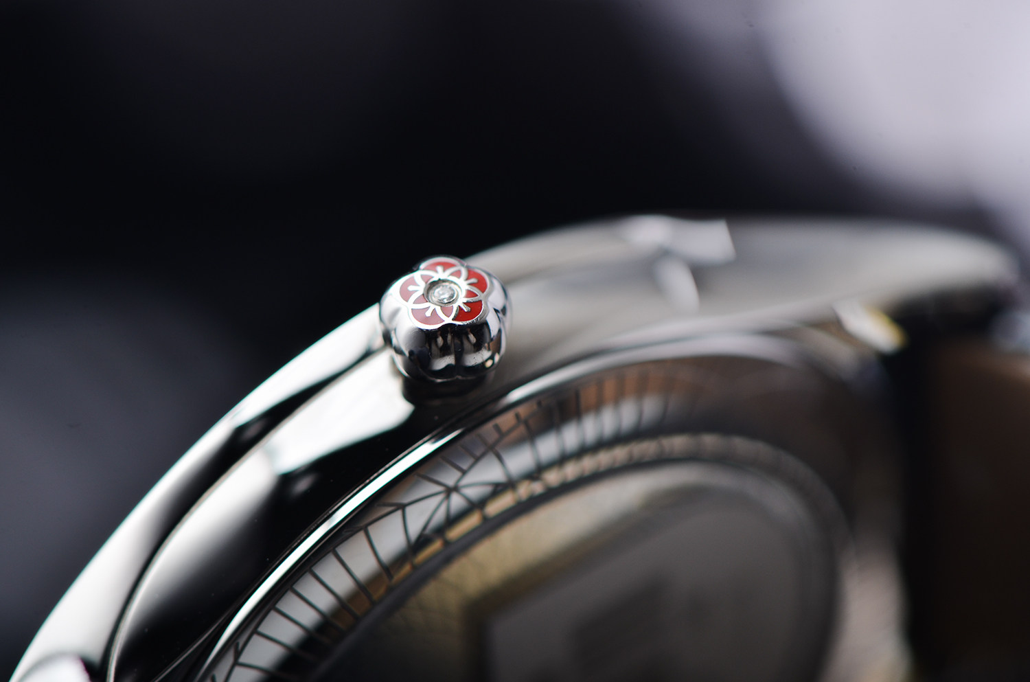 表壳:精钢表壳及表扣,表框原厂镶嵌38颗hao华天然美钻,共计约0.69克拉,花朵表冠镶嵌一颗钻石,约0.003克拉
