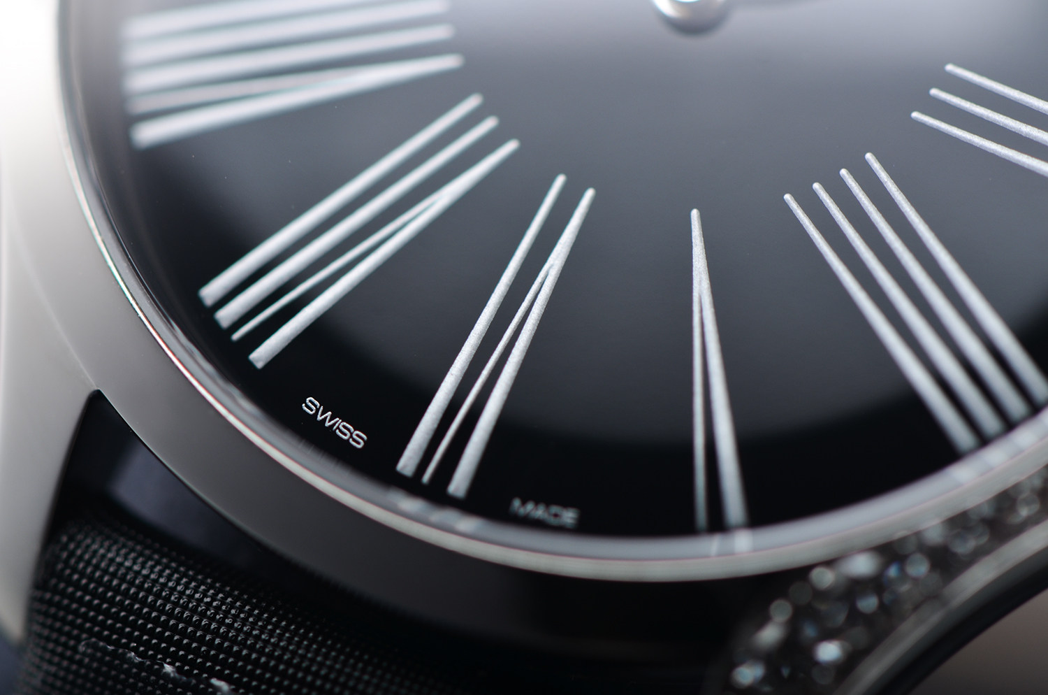 表盘:立体黑色亮漆表盘,罗马数字刻度