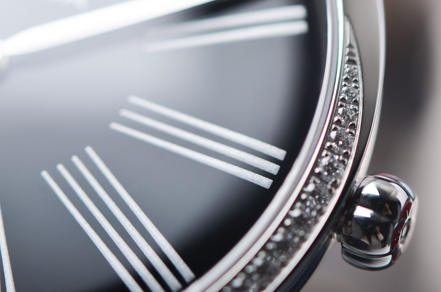 表盘采用经典黑色亮漆处理,深邃而富有层次。