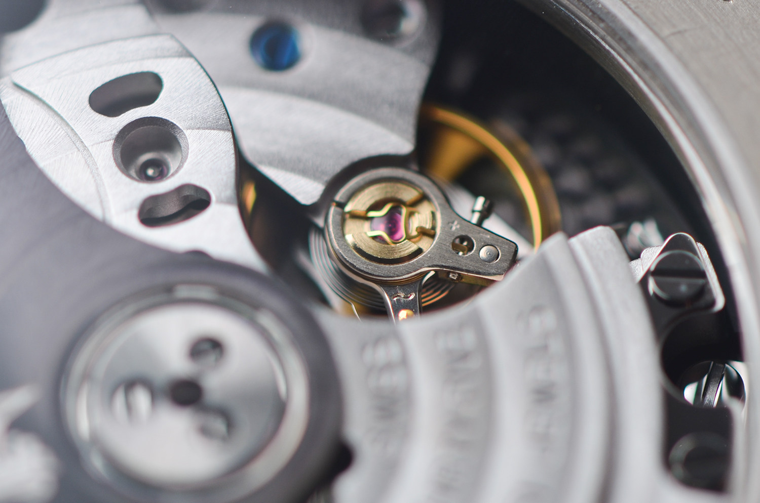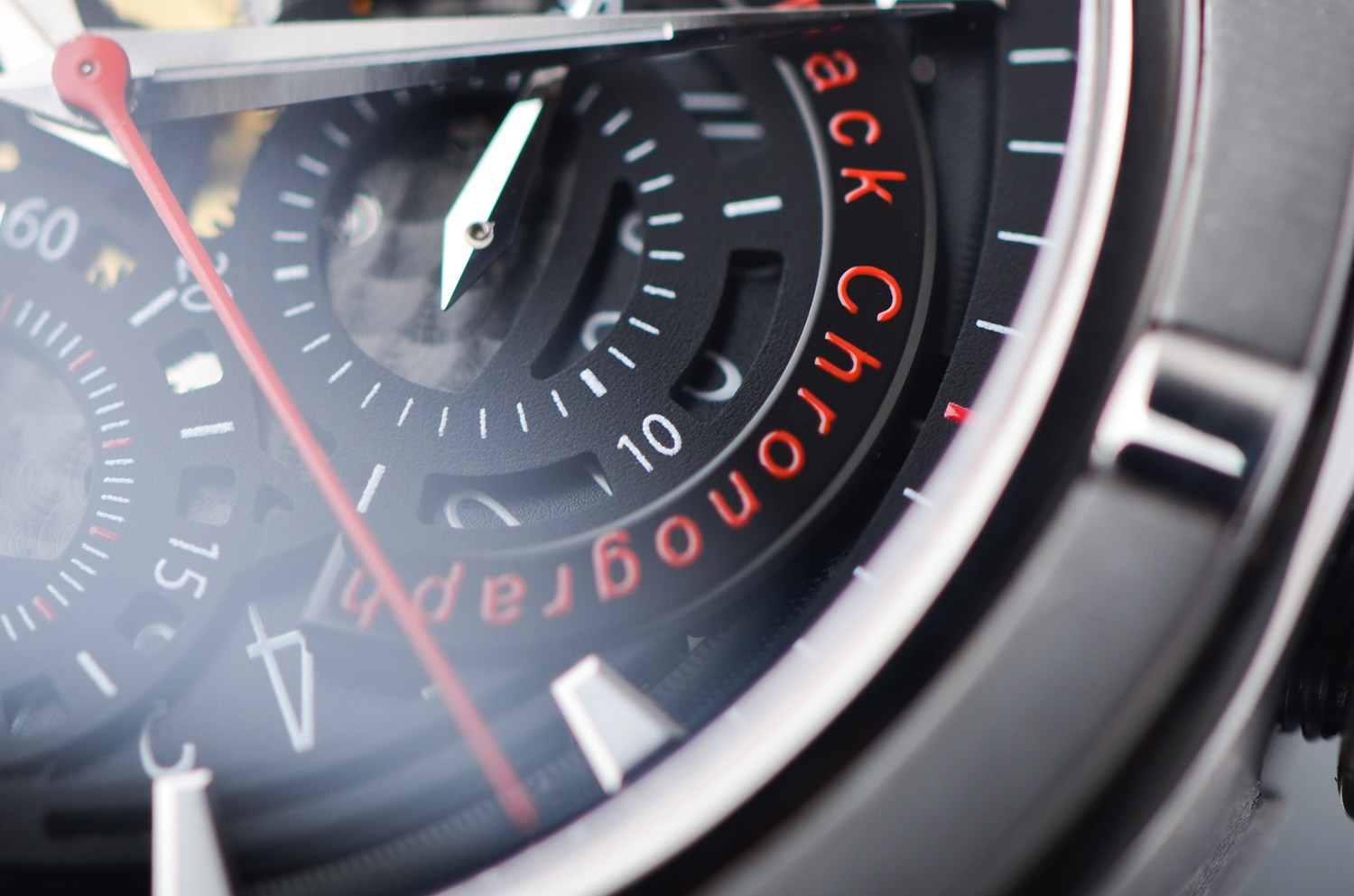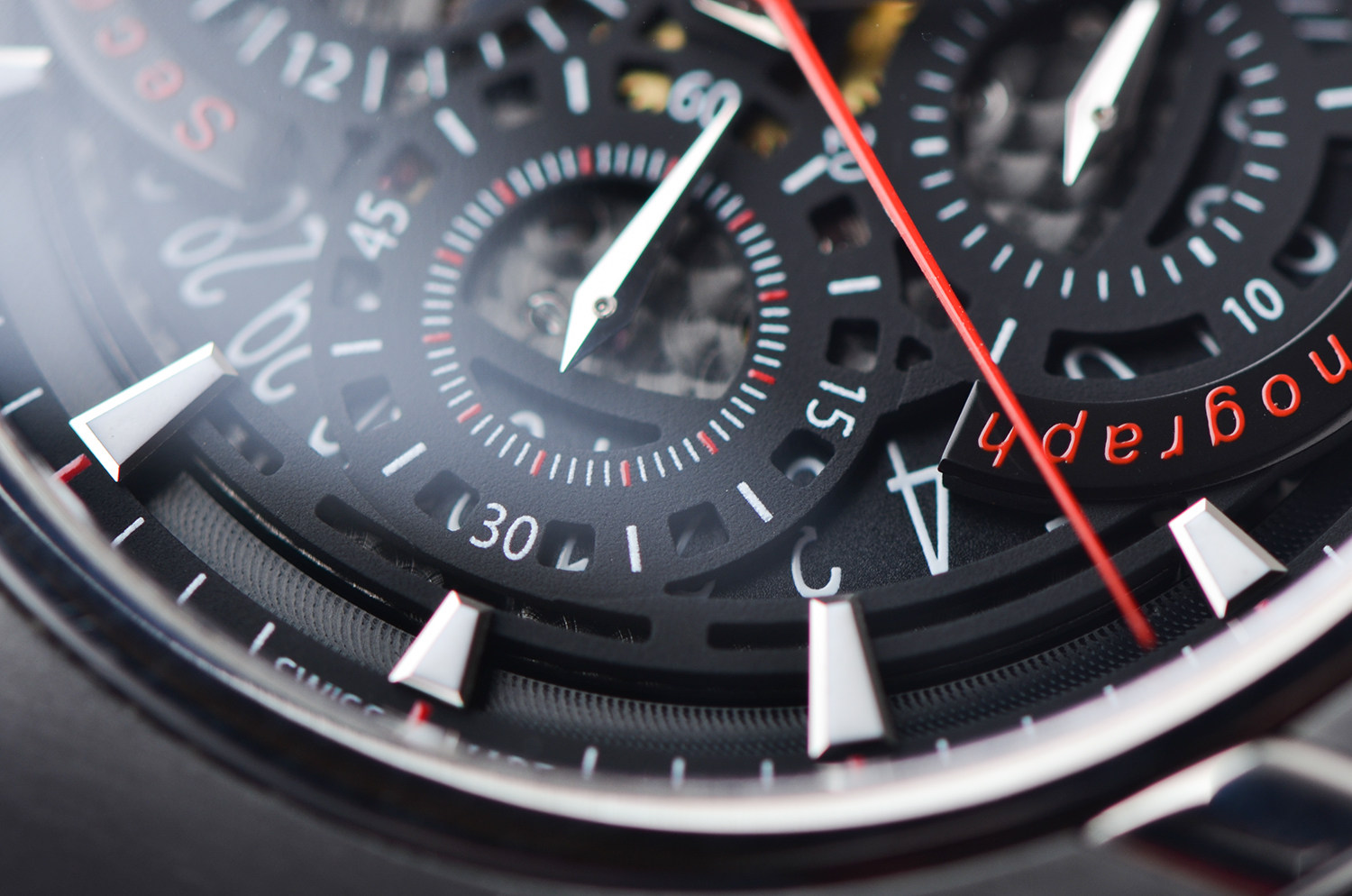 黑色开芯表盘 + 红色点缀,极具赛车与机械感