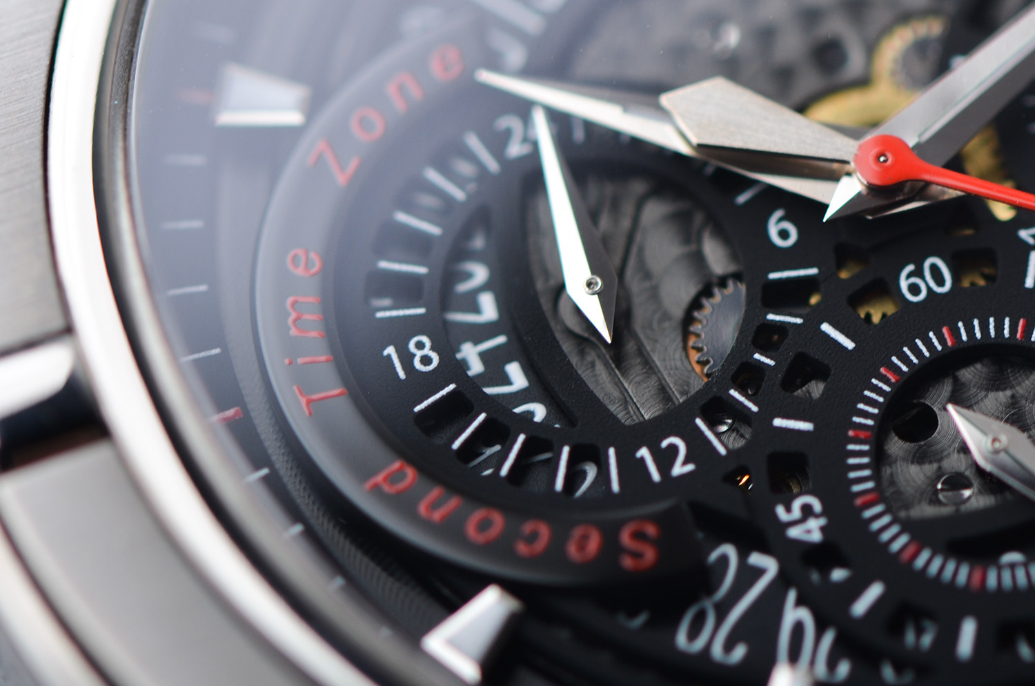 表盘:立体黑色镂空计时表盘,日历视窗,9点位GMT第二时区显示,6点位独立小秒针,3点位30分钟计时功能。