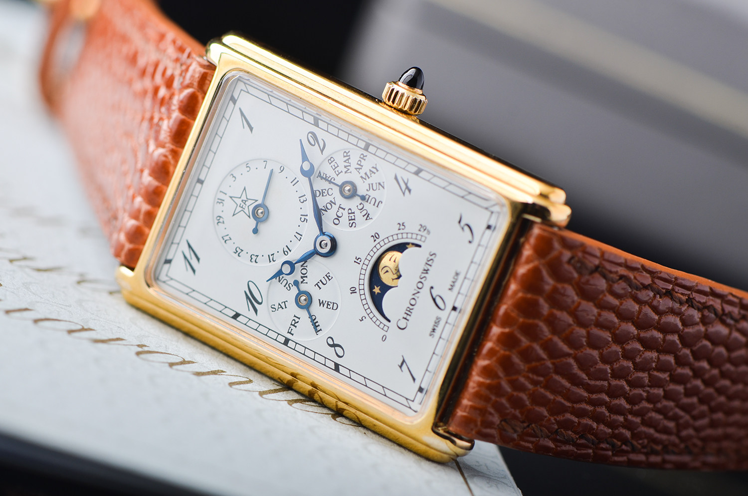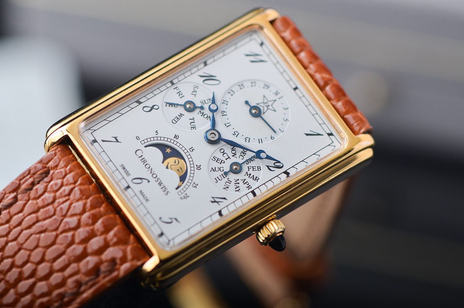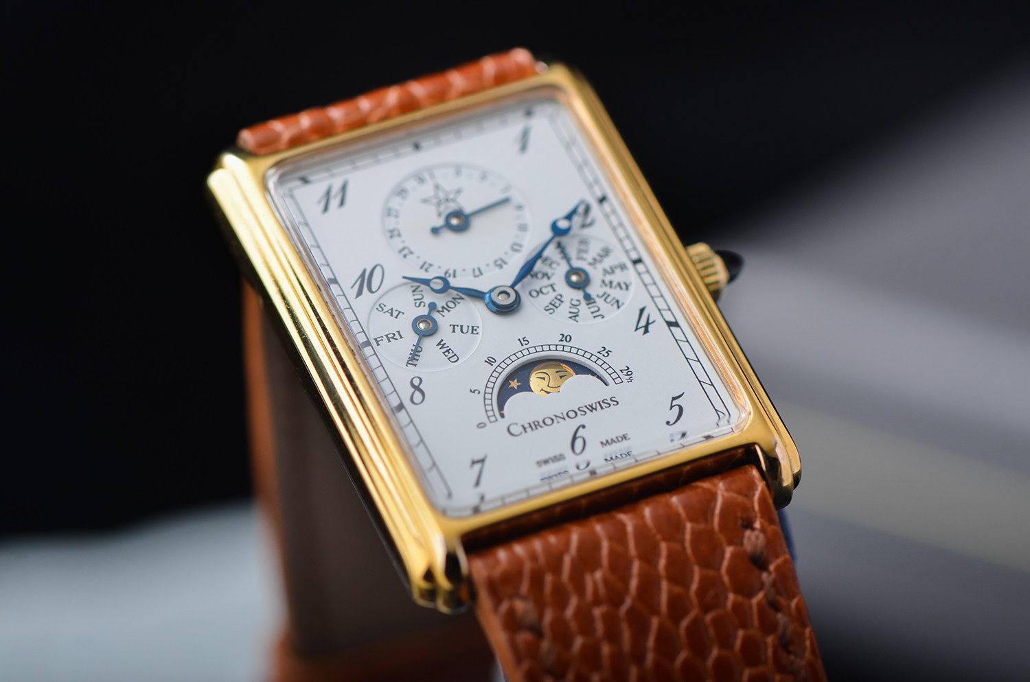 在当代制表中,矩形表壳 + 全历月相 + 手动机械 本就已属少数,而这枚 Chronoswiss CH70170,更是其中极具辨识度与收藏气质的一款。