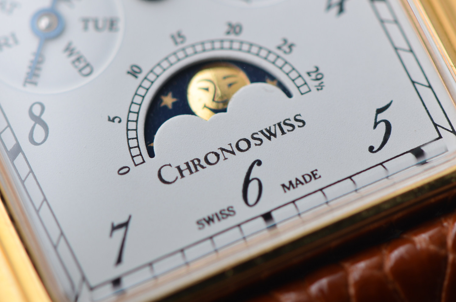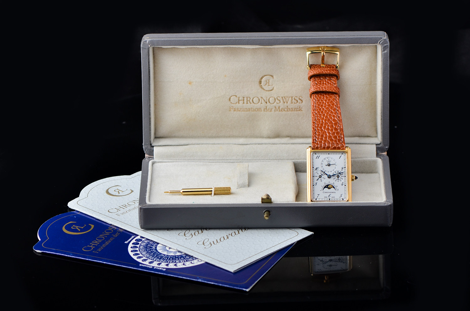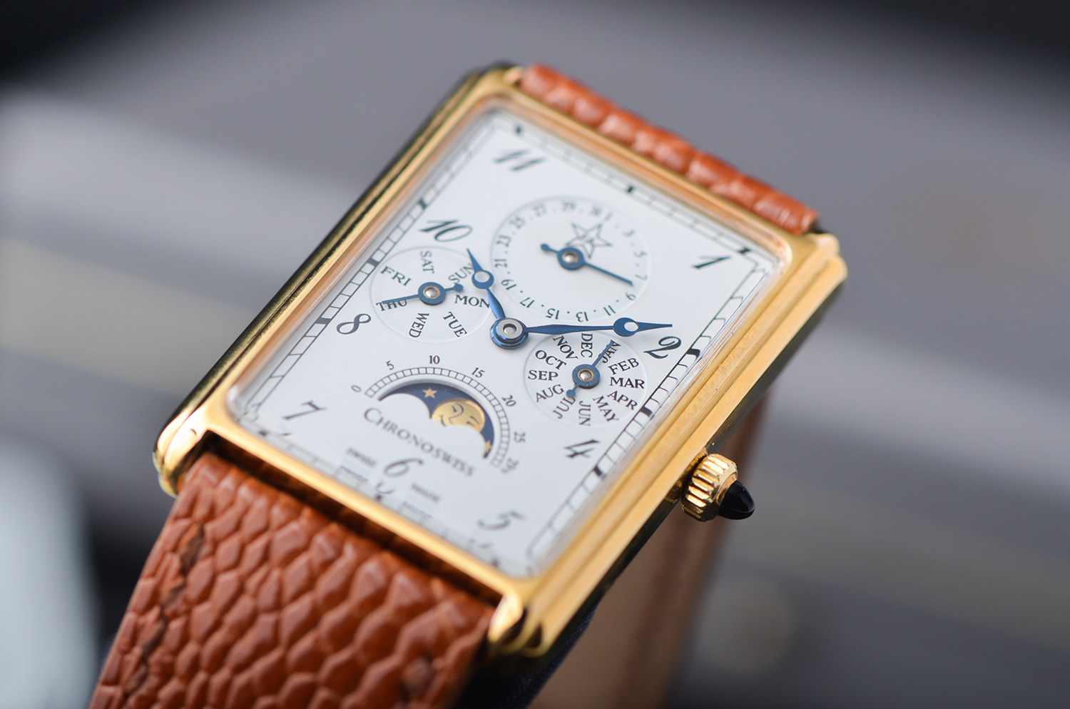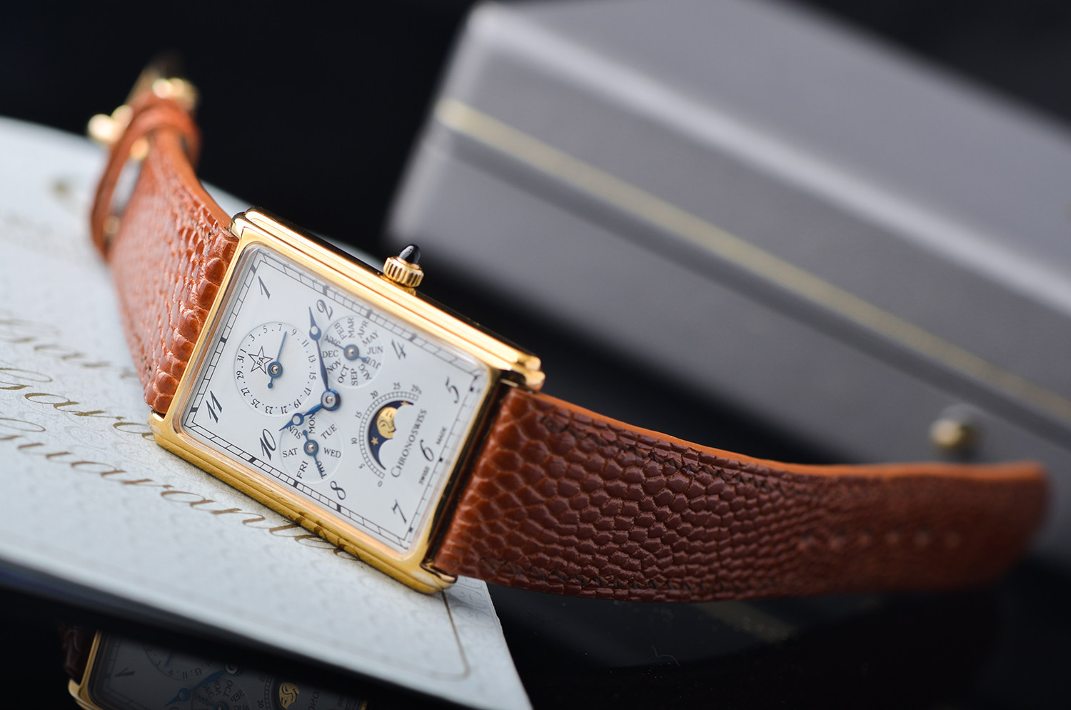 在当代制表中,矩形表壳 + 全历月相 + 手动机械 本就已属少数,而这枚 Chronoswiss CH70170,更是其中极具辨识度与收藏气质的一款。