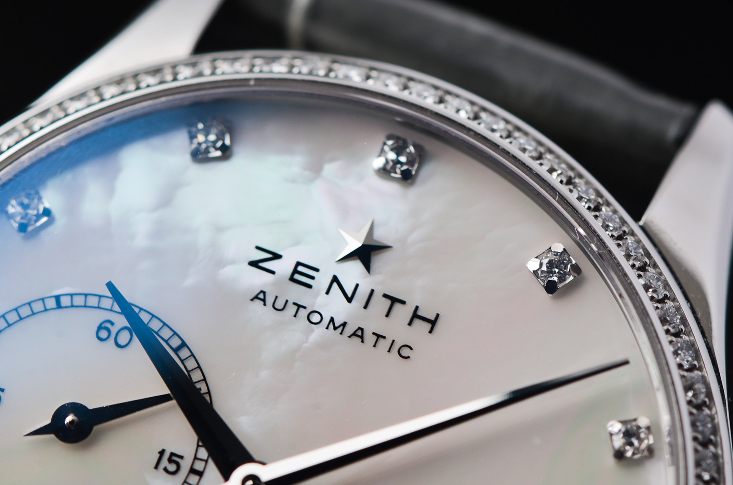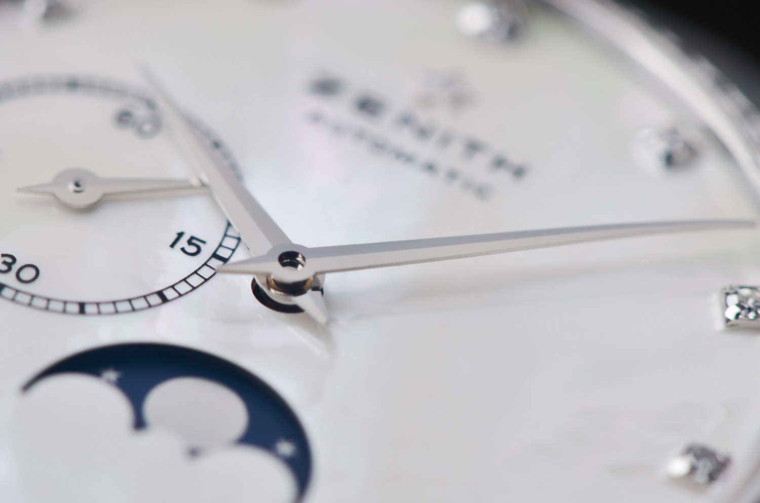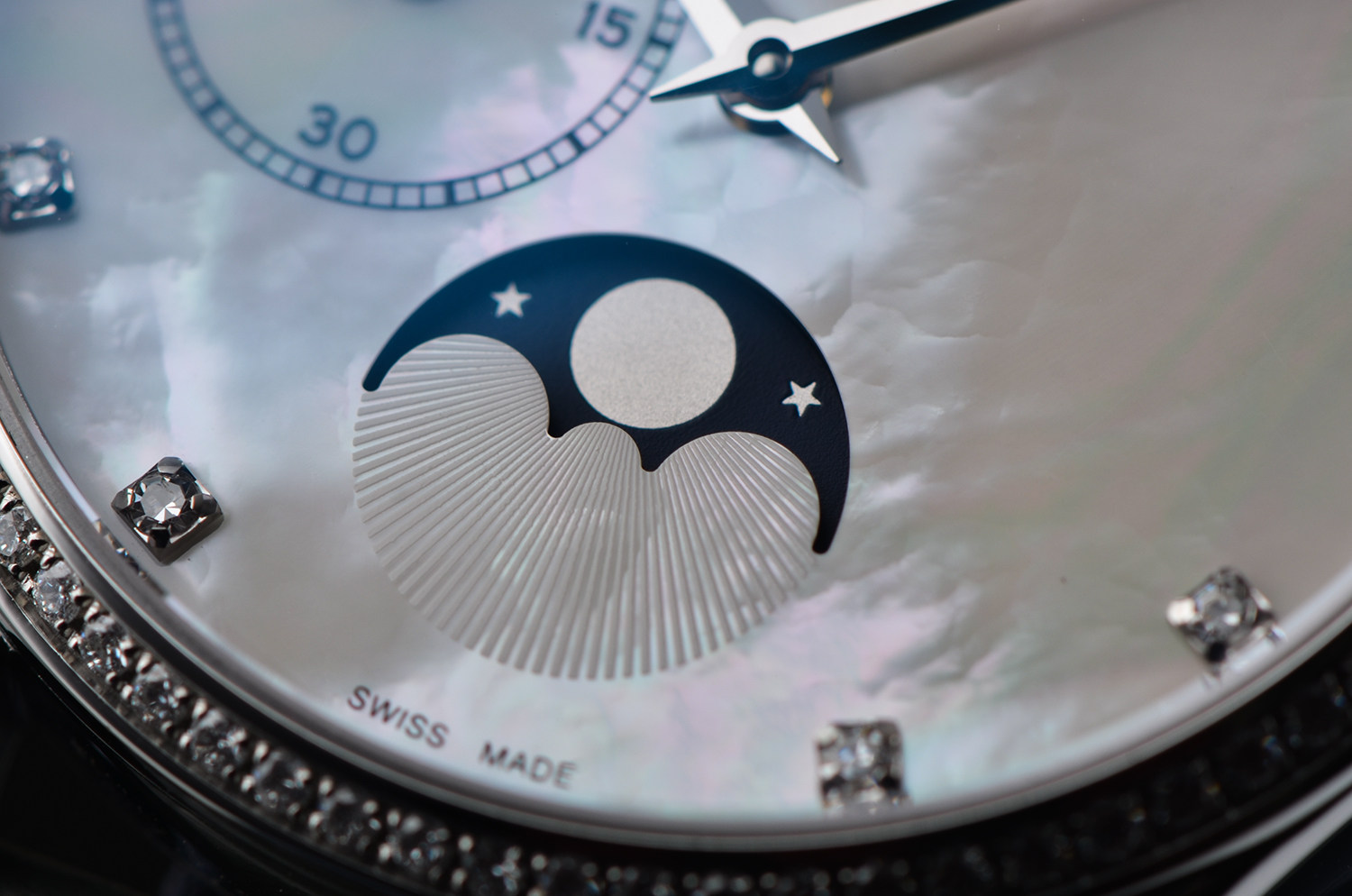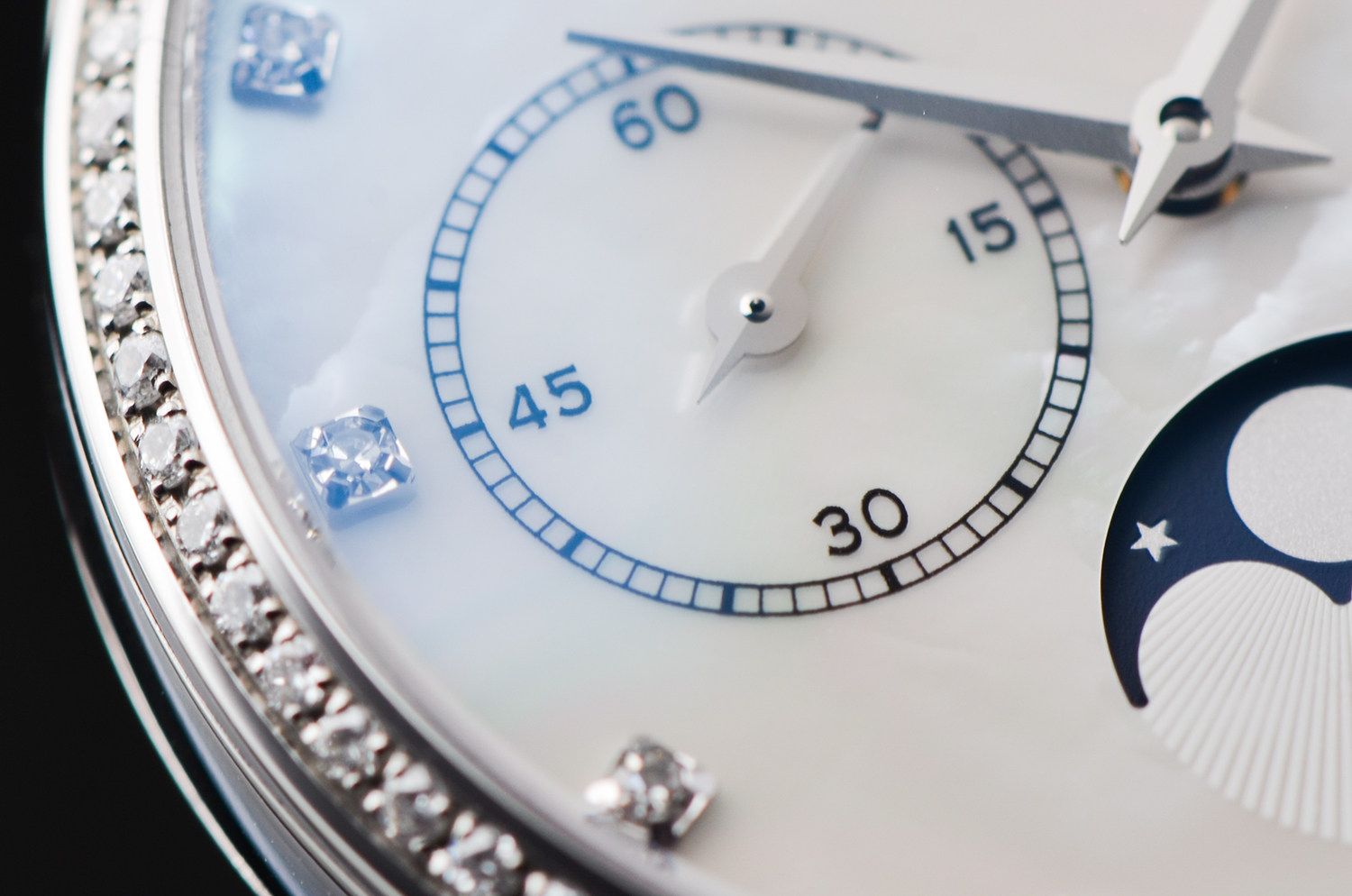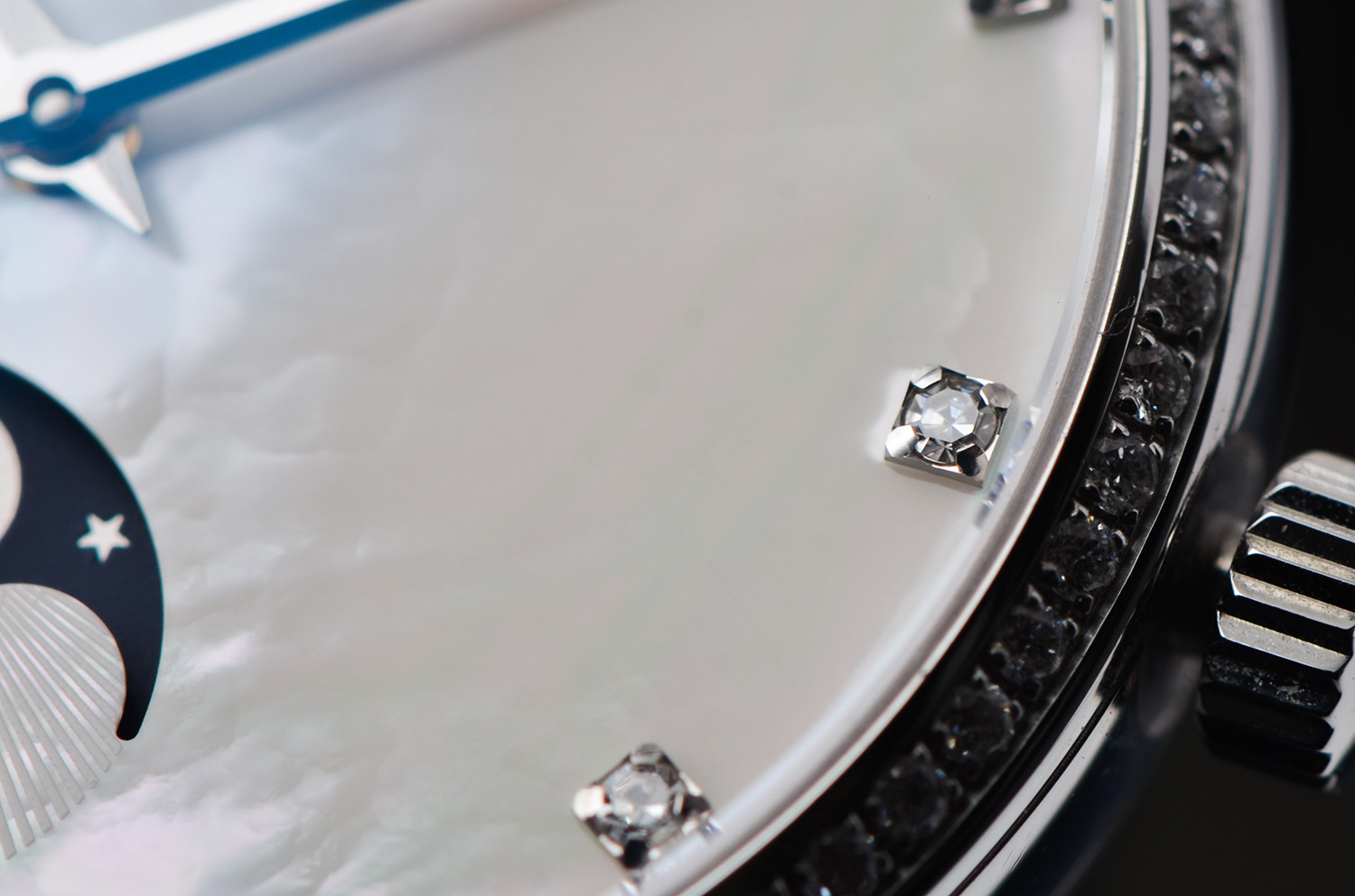 表盘:立体银白色珍珠贝母表盘,11颗钻石时标,月相显示