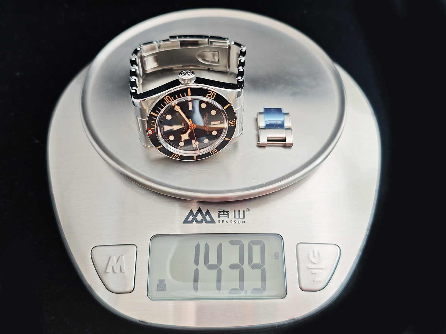 表壳:精钢表壳,黑色单向可旋转阳极氧化铝字计时表圈