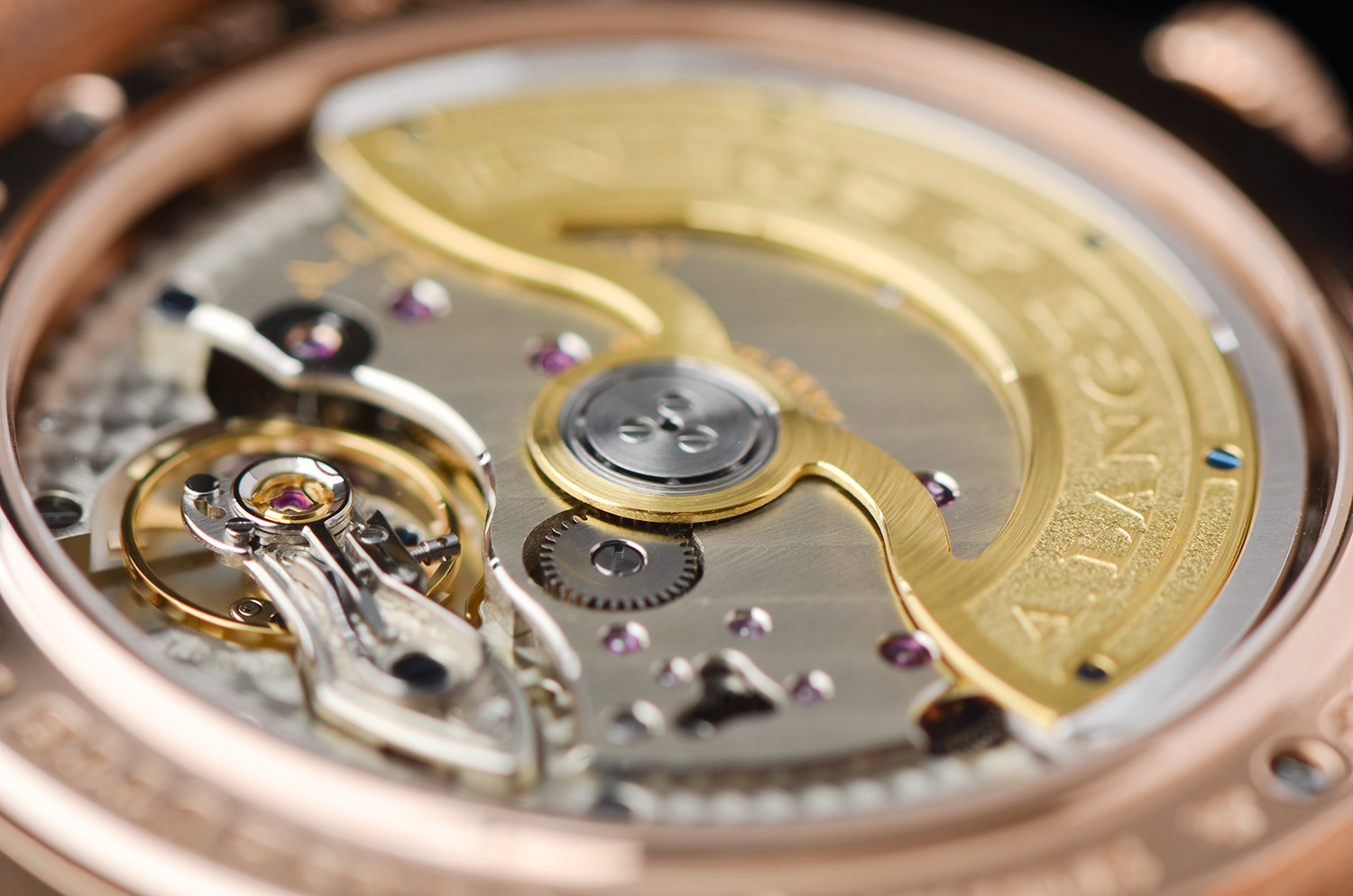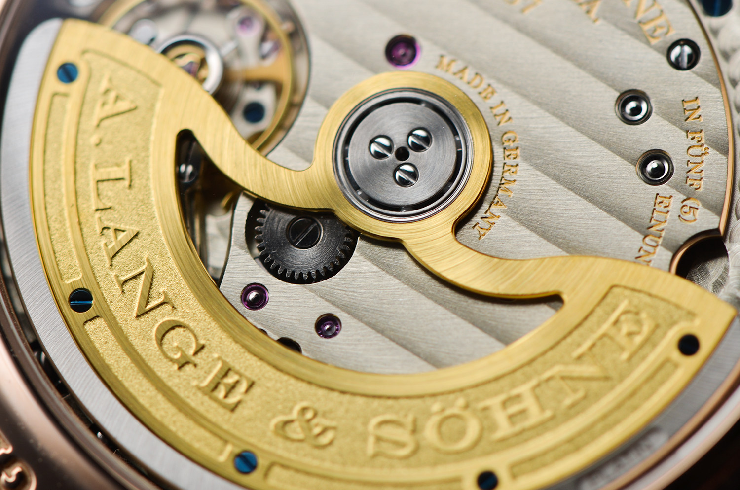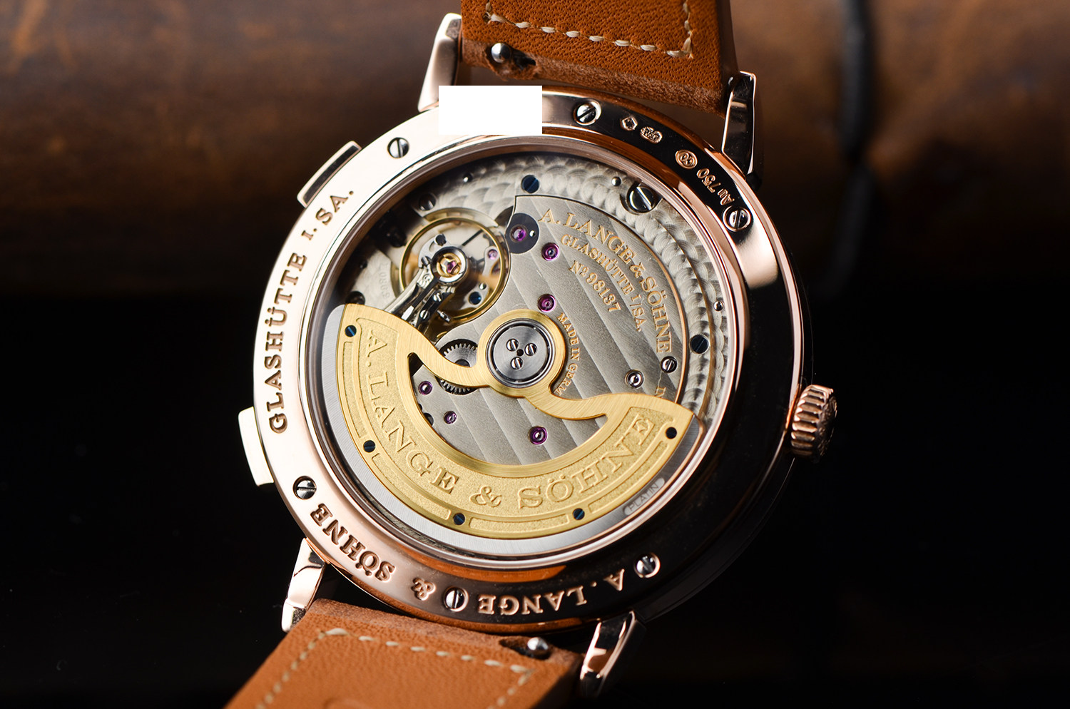 透过蓝宝石底盖,可以看到朗格标志性的 德国银机芯夹板、手工雕刻摆轮夹板、蓝钢螺丝,每一处打磨都坚持“看不见的地方也要做到极致”。