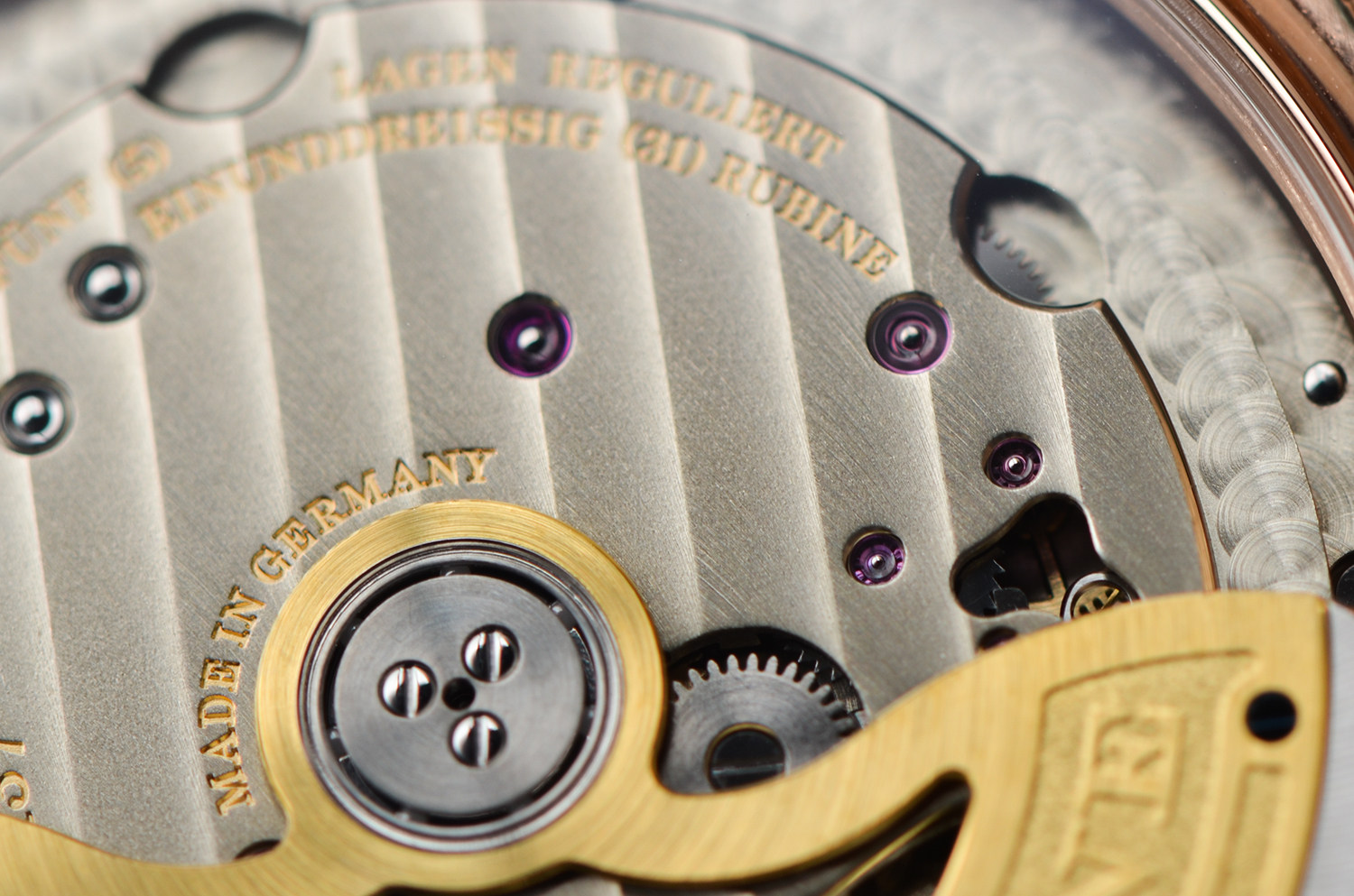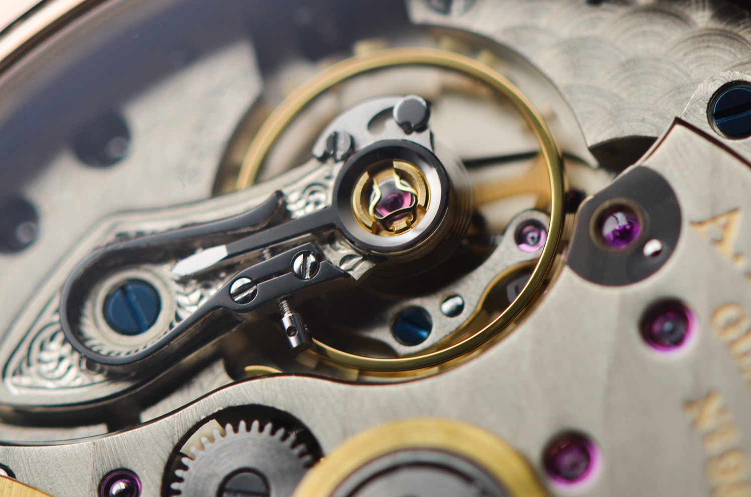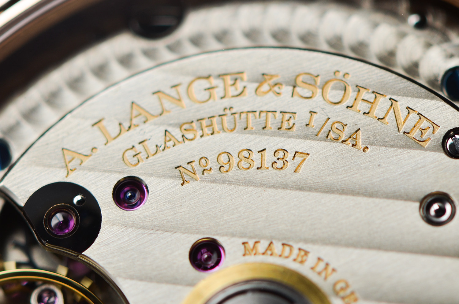 透过蓝宝石底盖,可以看到朗格标志性的 德国银机芯夹板、手工雕刻摆轮夹板、蓝钢螺丝,每一处打磨都坚持“看不见的地方也要做到极致”。