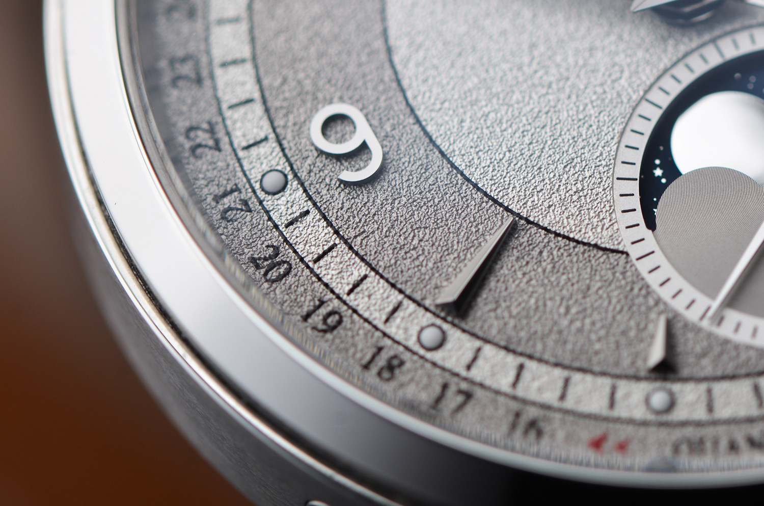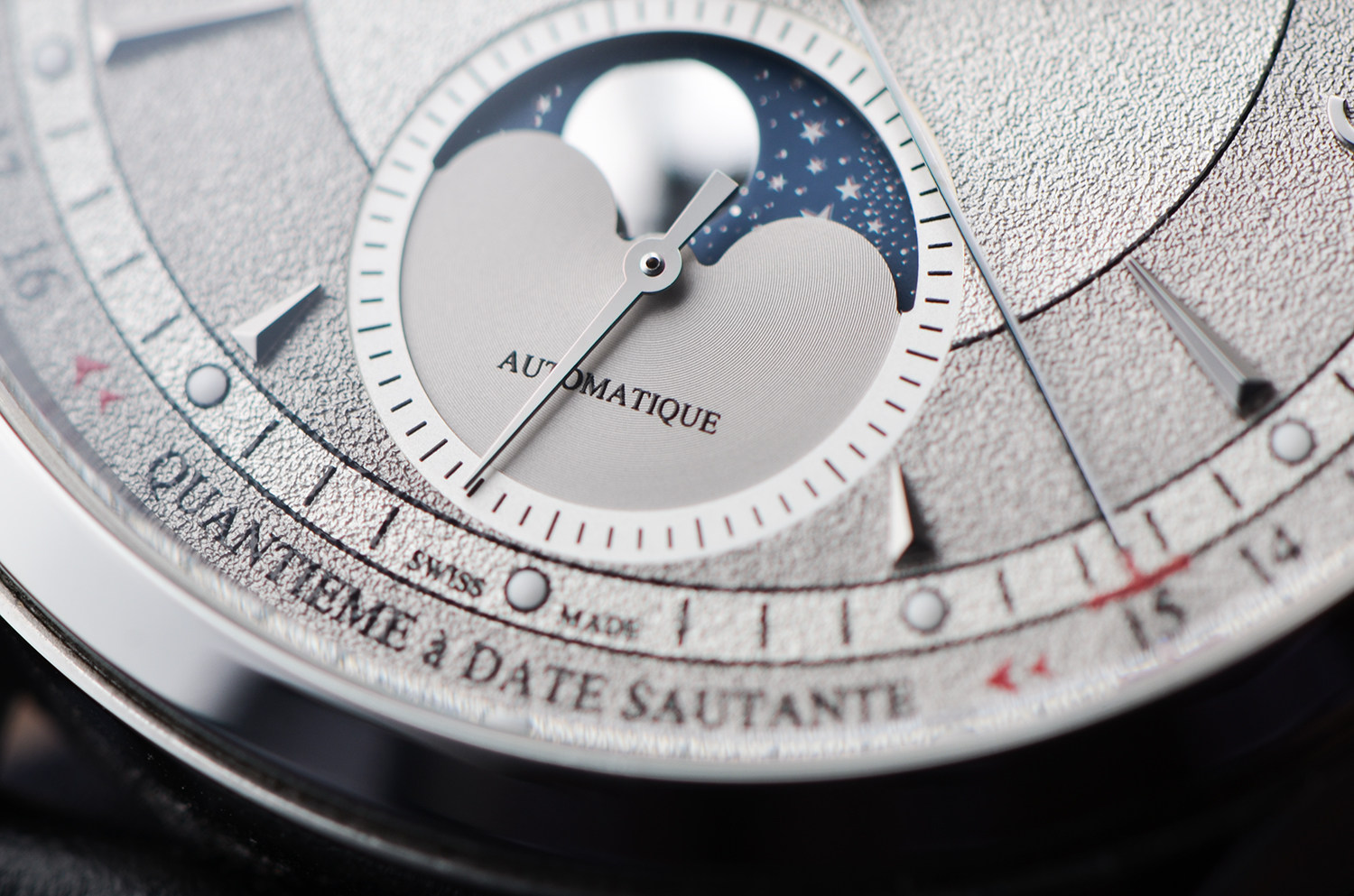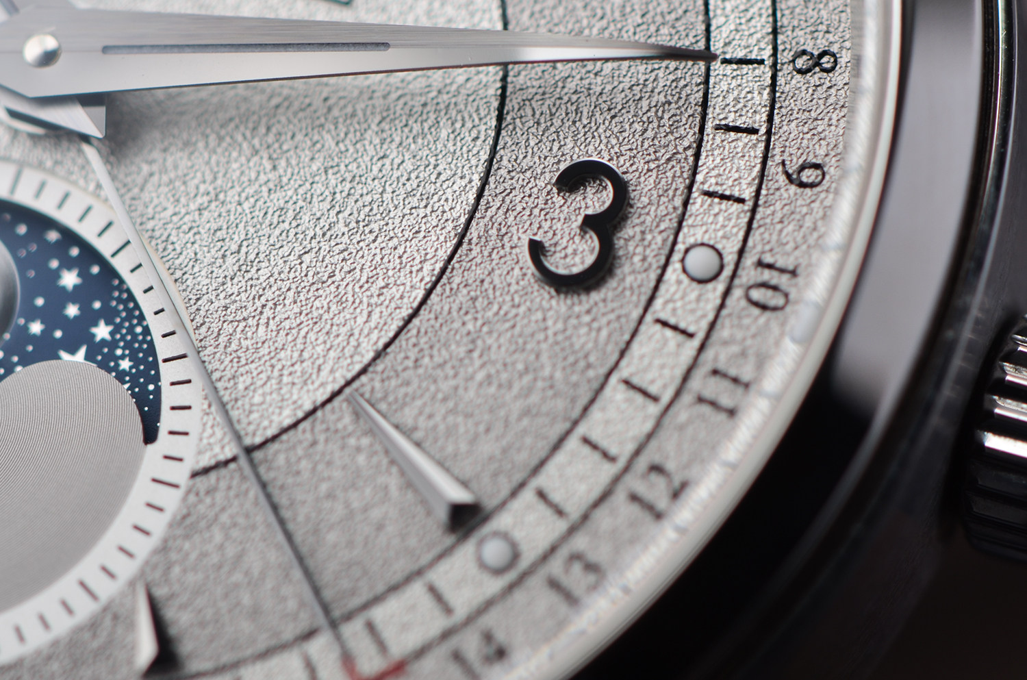 表盘:立体银灰双色粒面工艺全历月相表盘