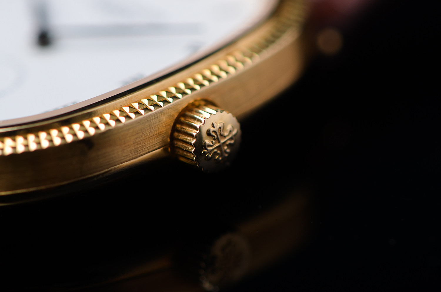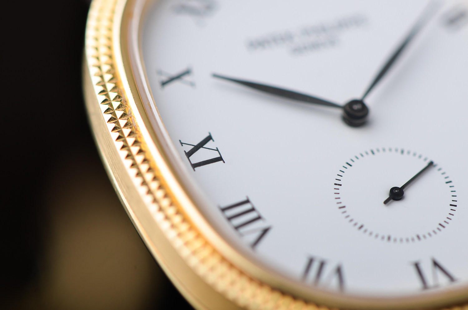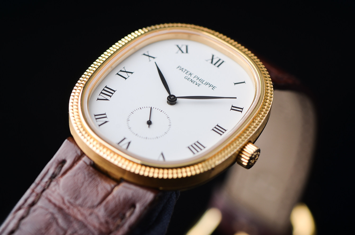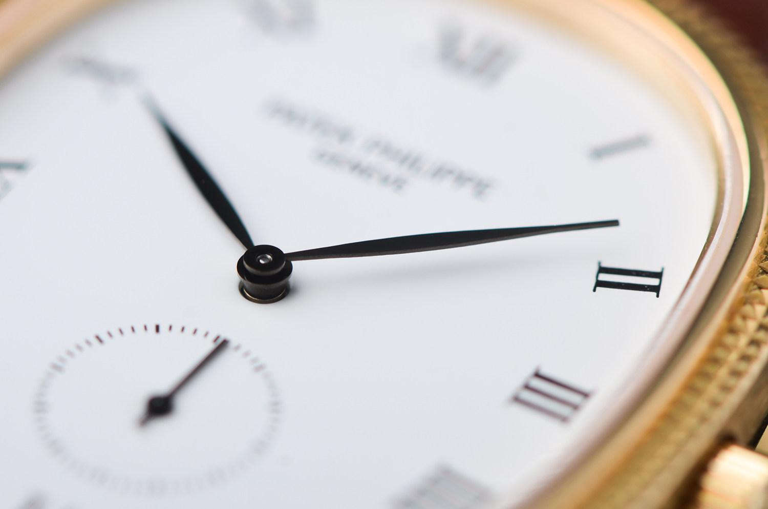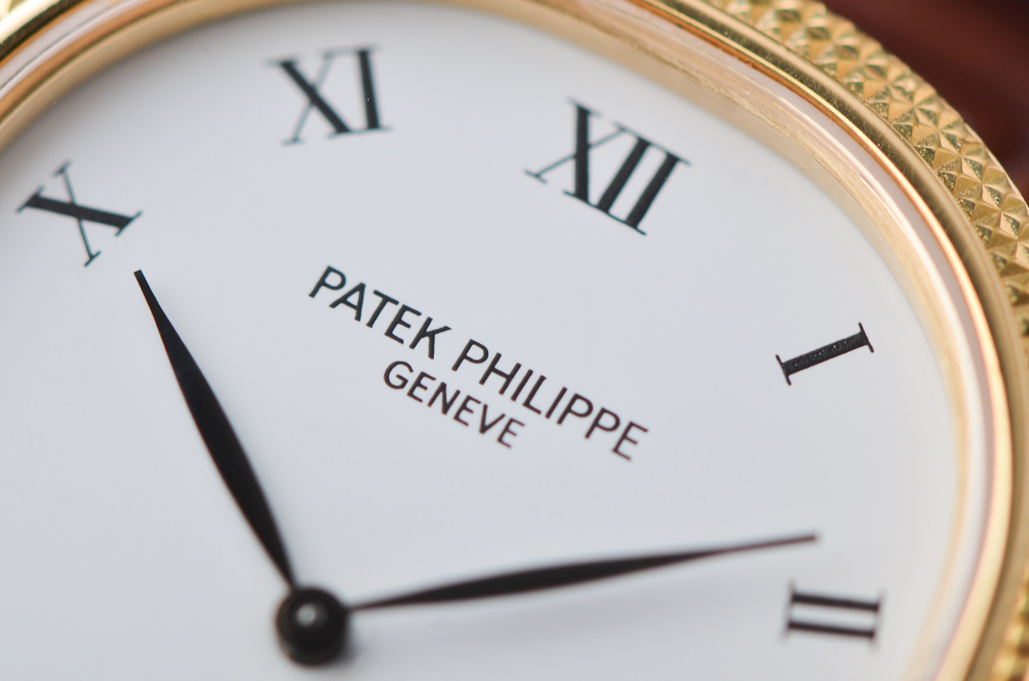 18K黄金表壳温润含蓄,表圈采用经典的巴黎钉(Clous de Paris)装饰,在光线下泛起细腻而克制的光泽。这一细节,通常只属于百达翡丽更高等级的正装腕表。