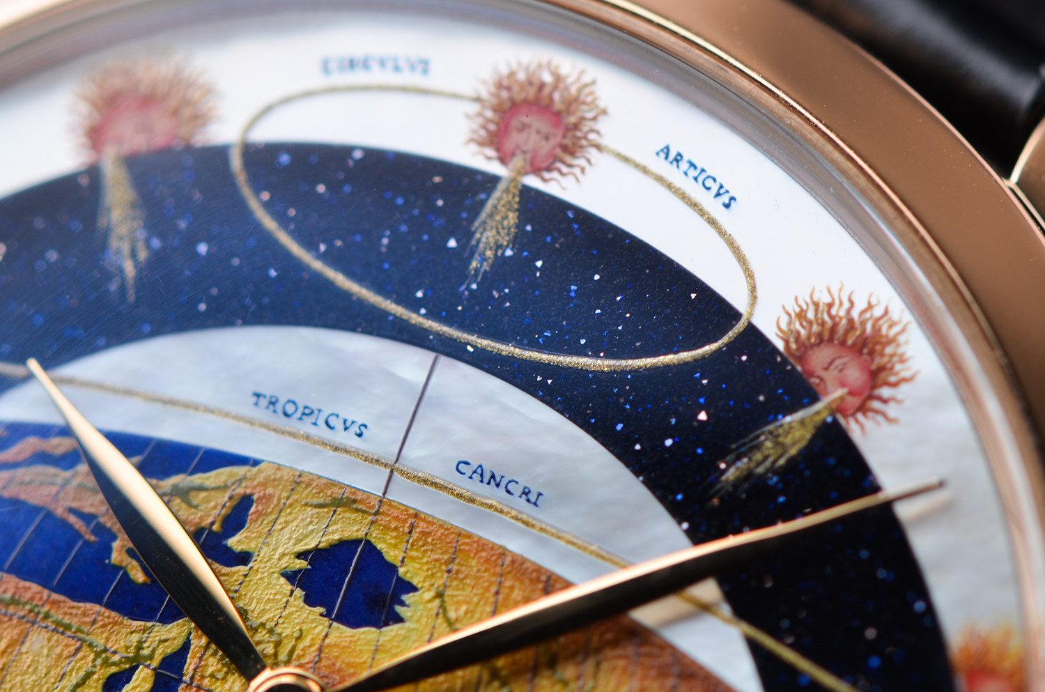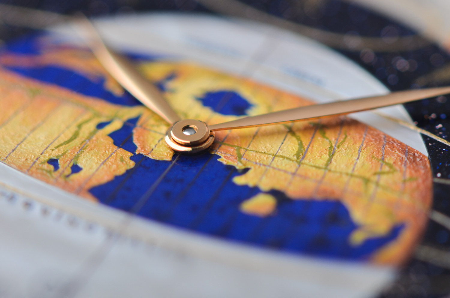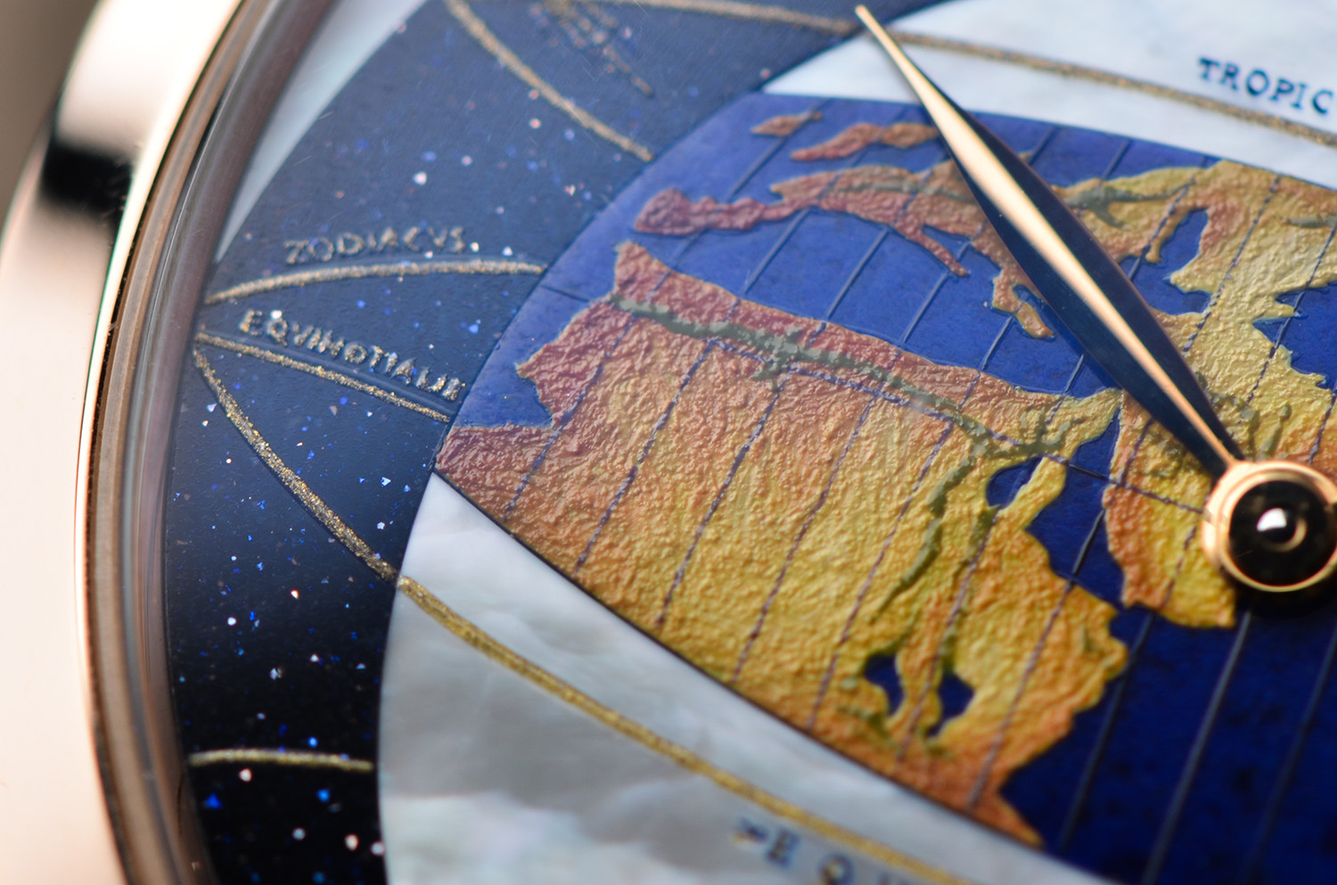 表盘:立体彩绘珐琅地图、珍珠贝母、沙金石三种材质表盘,玫瑰金指针