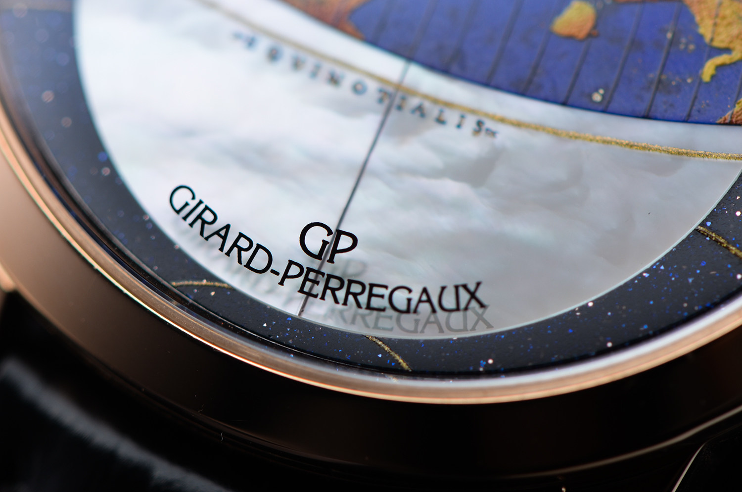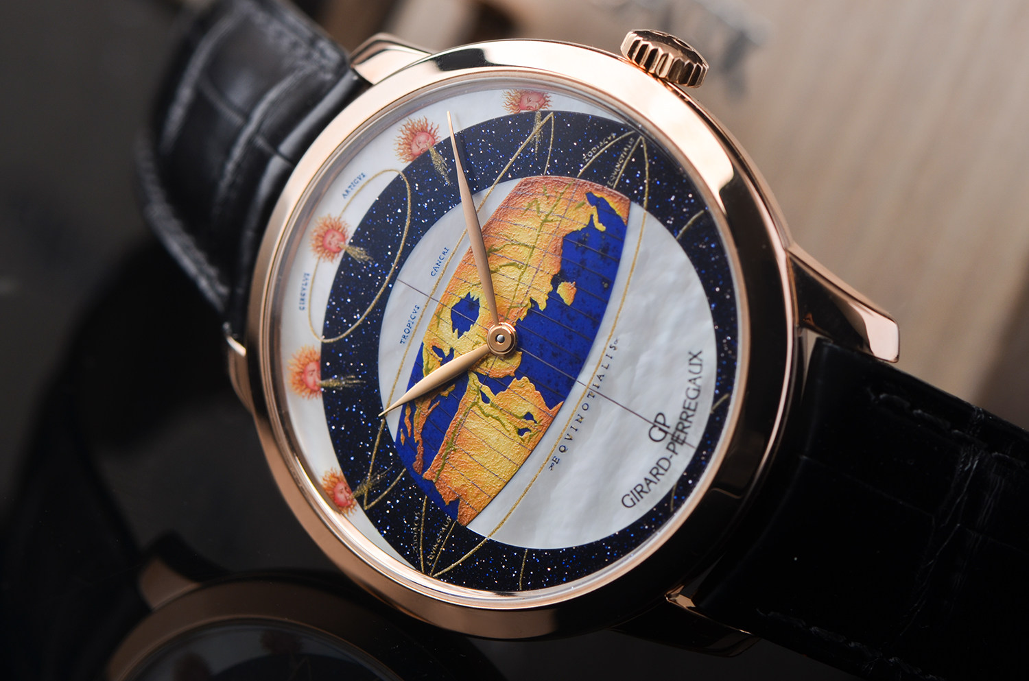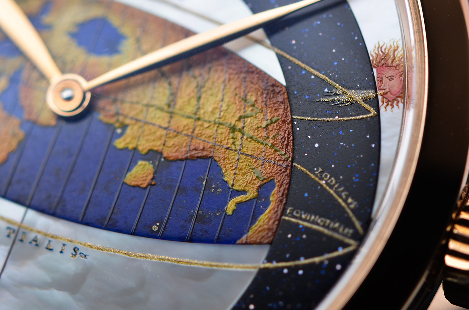 表盘:立体彩绘珐琅地图、珍珠贝母、沙金石三种材质表盘,玫瑰金指针