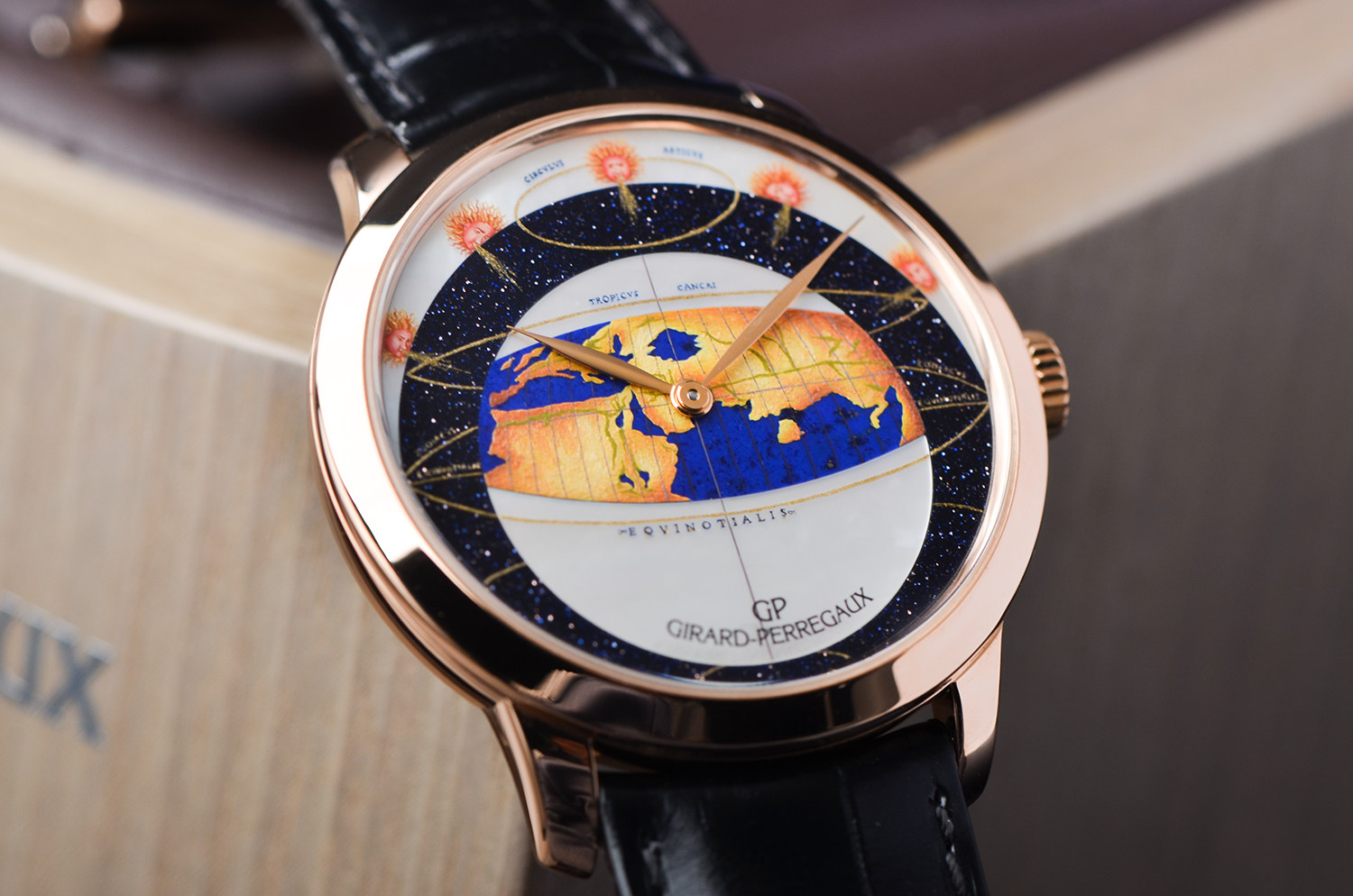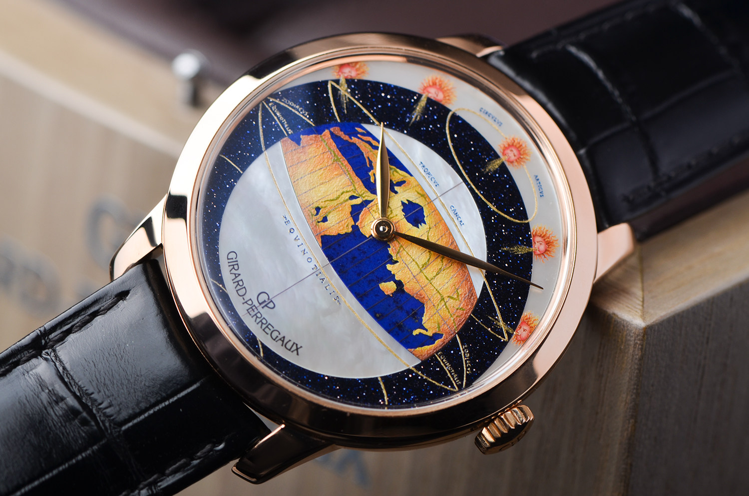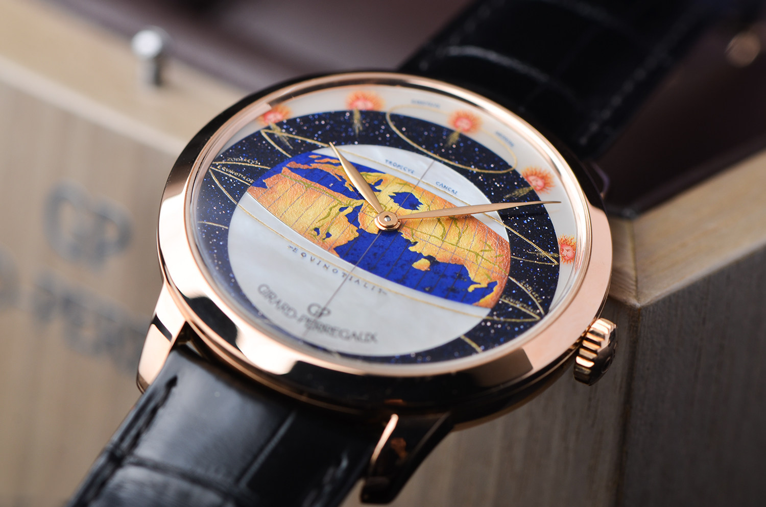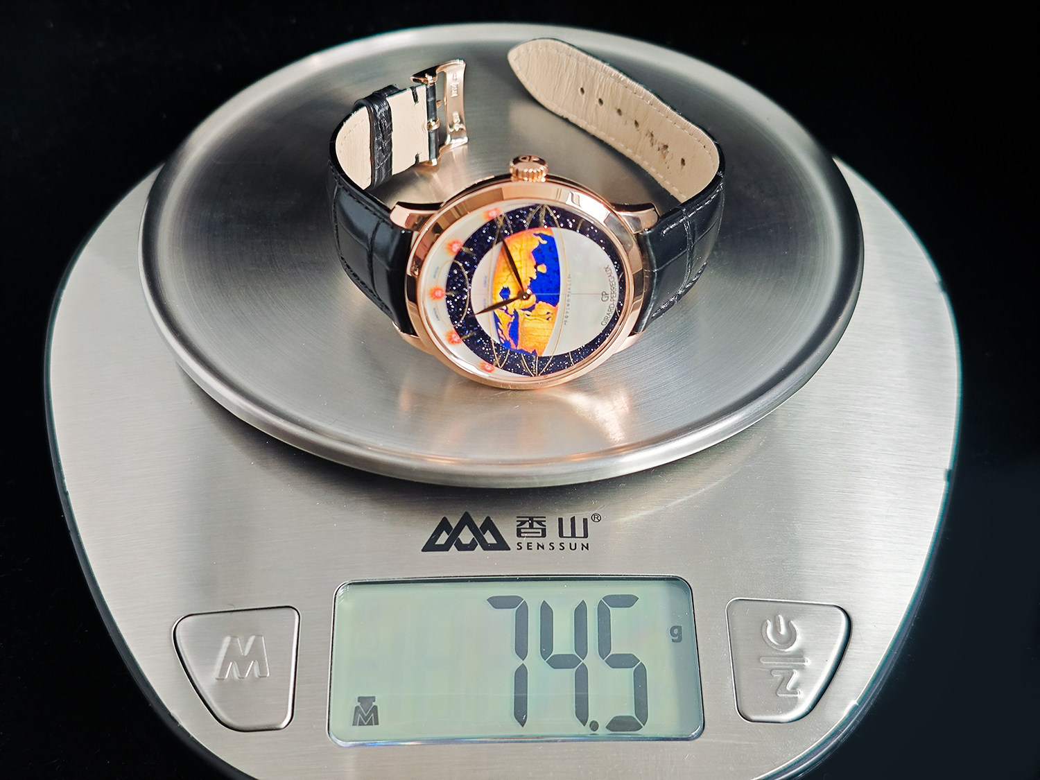 【售价119800RMB 地心说限量版,限量18枚,彩绘珐琅、珍珠贝母,沙金石三种材质表盘,盒证齐全2008年,重74.5克】