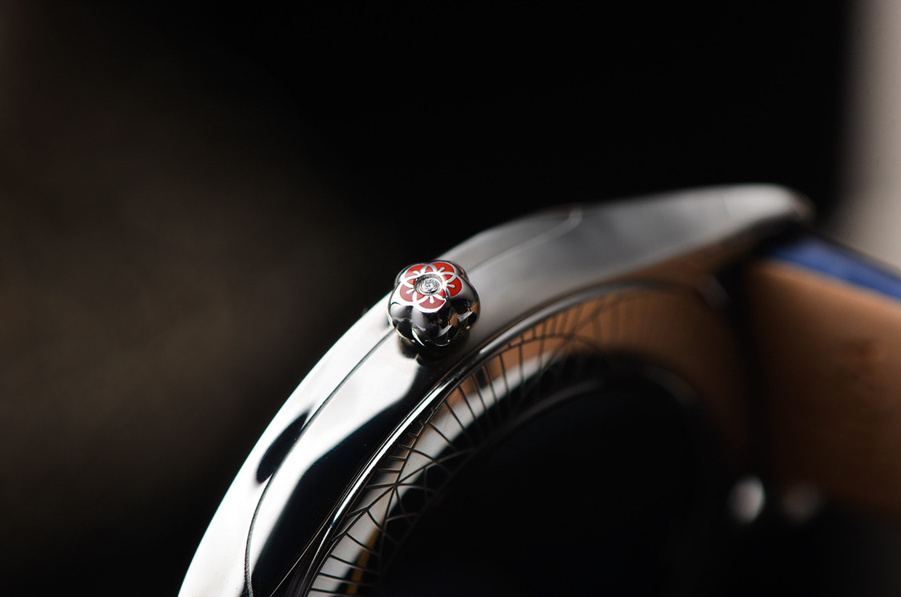 表壳:精钢表壳及表扣,表框原厂镶嵌32颗hao华天然美钻,共计约0.49克拉,花朵表冠镶嵌一颗钻石,约0.003克拉