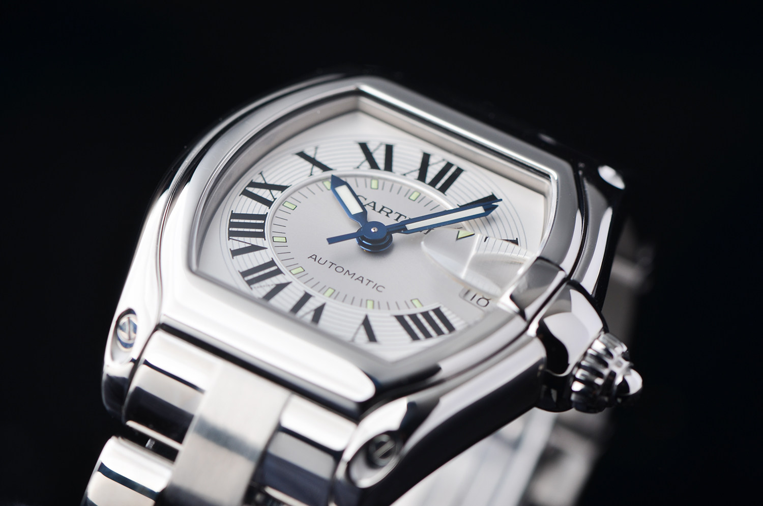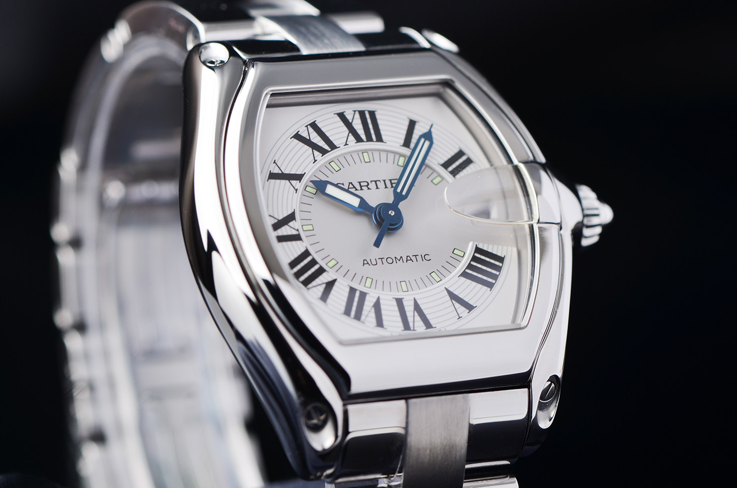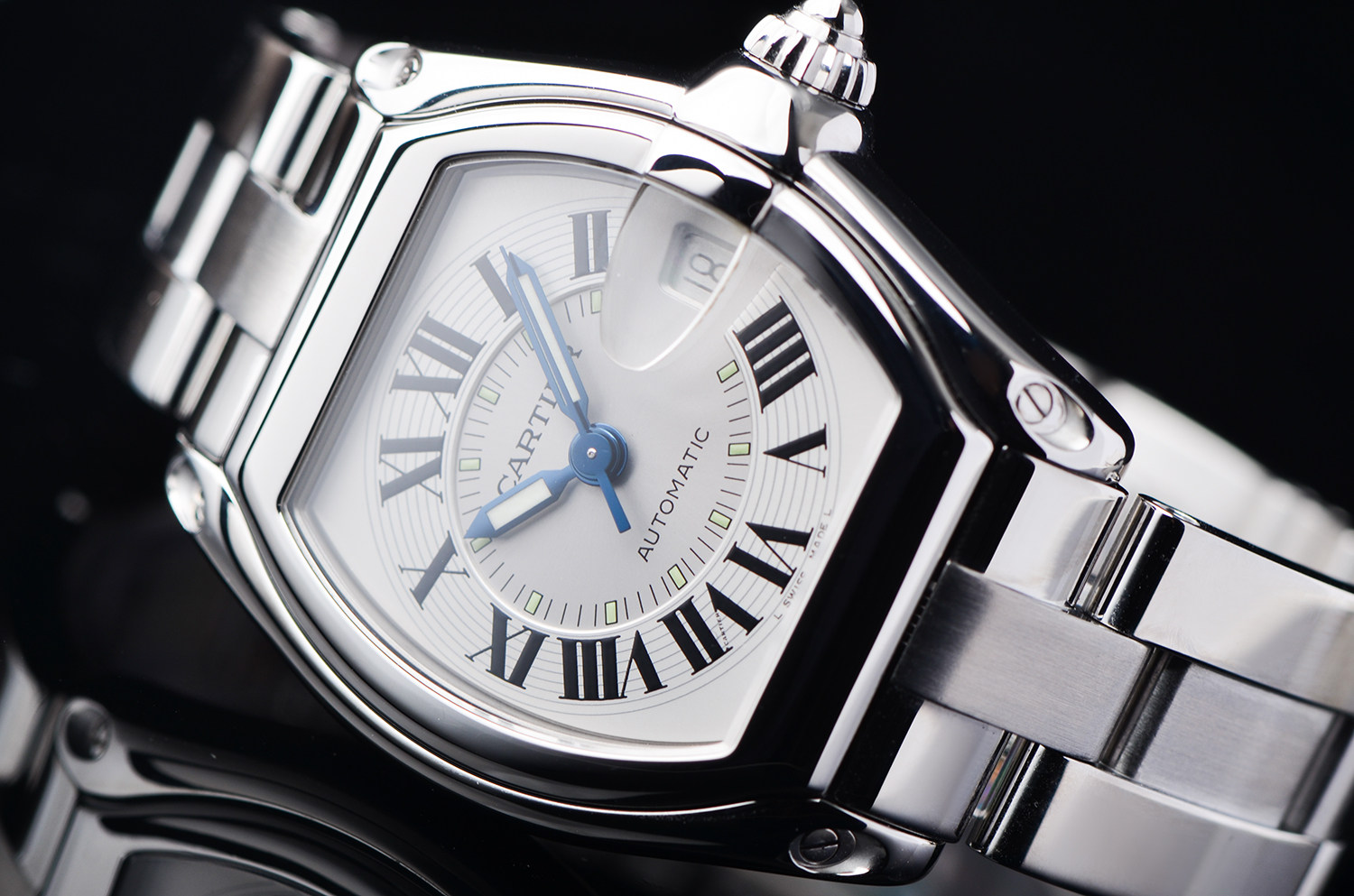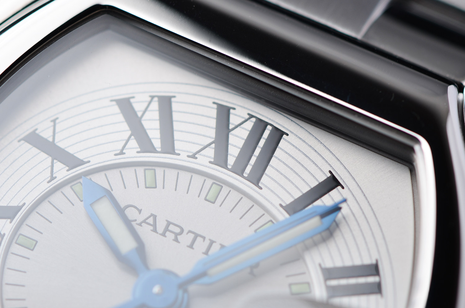 银灰双色表盘搭配标志性的罗马数字与蓝钢指针,延续卡地亚一贯的优雅基因;3点位放大镜日期窗不仅实用,也成为Roadster系列最具标志性的设计之一。