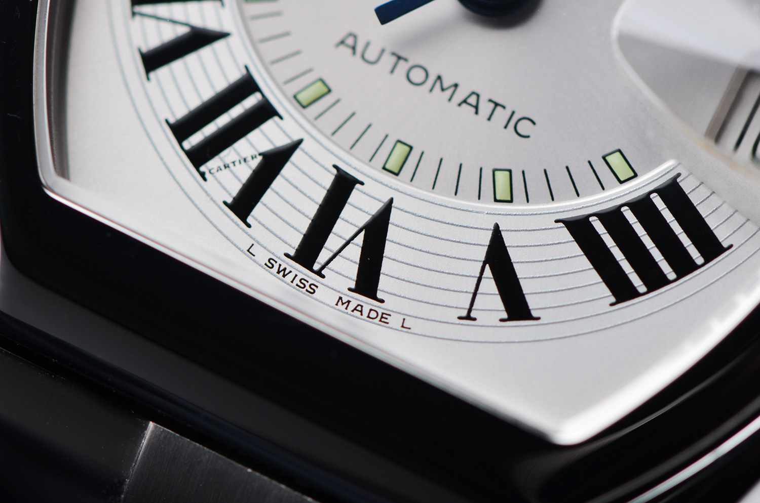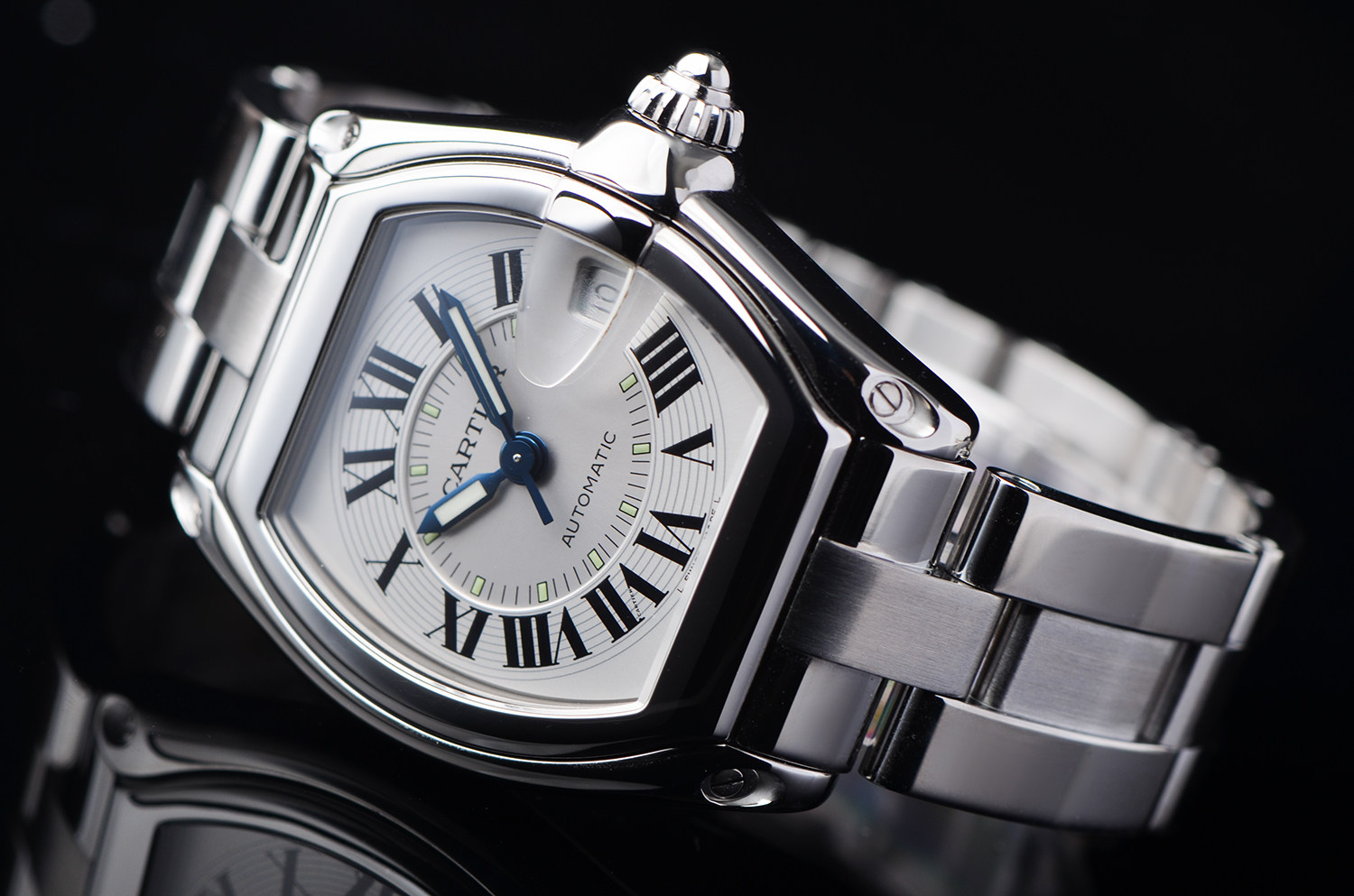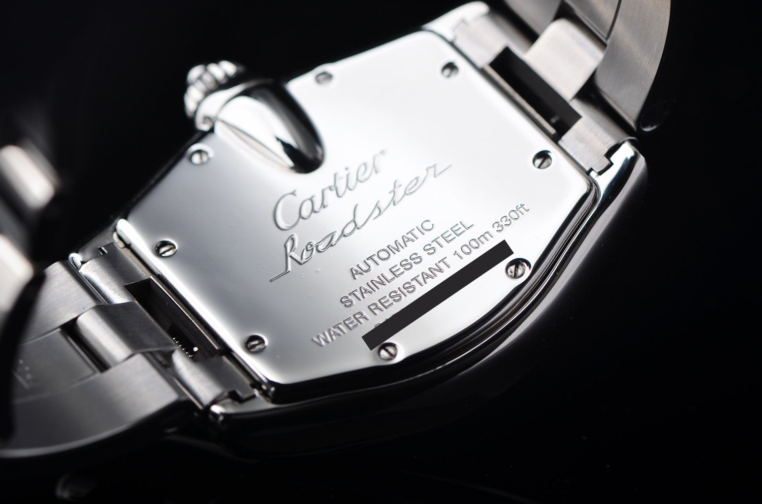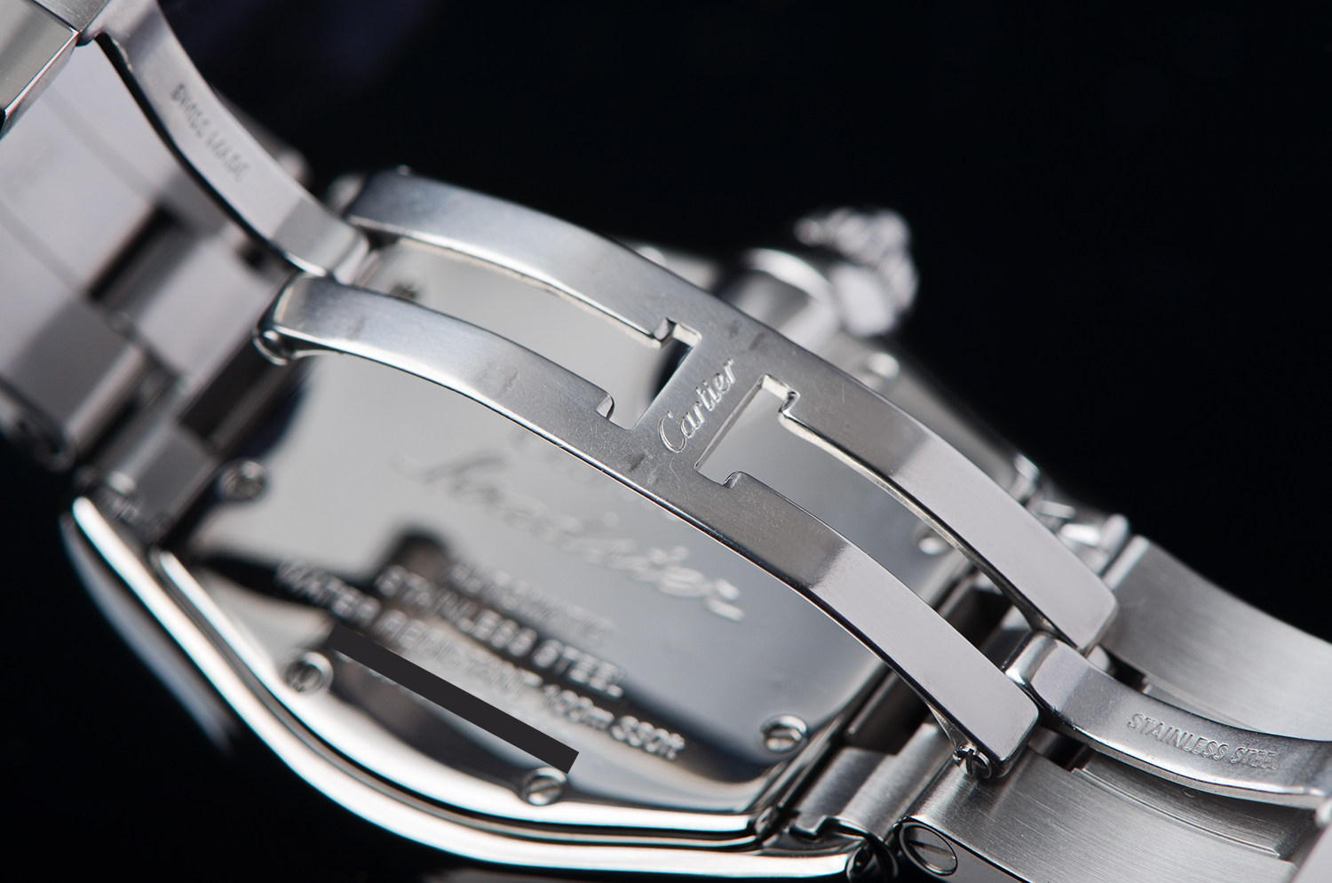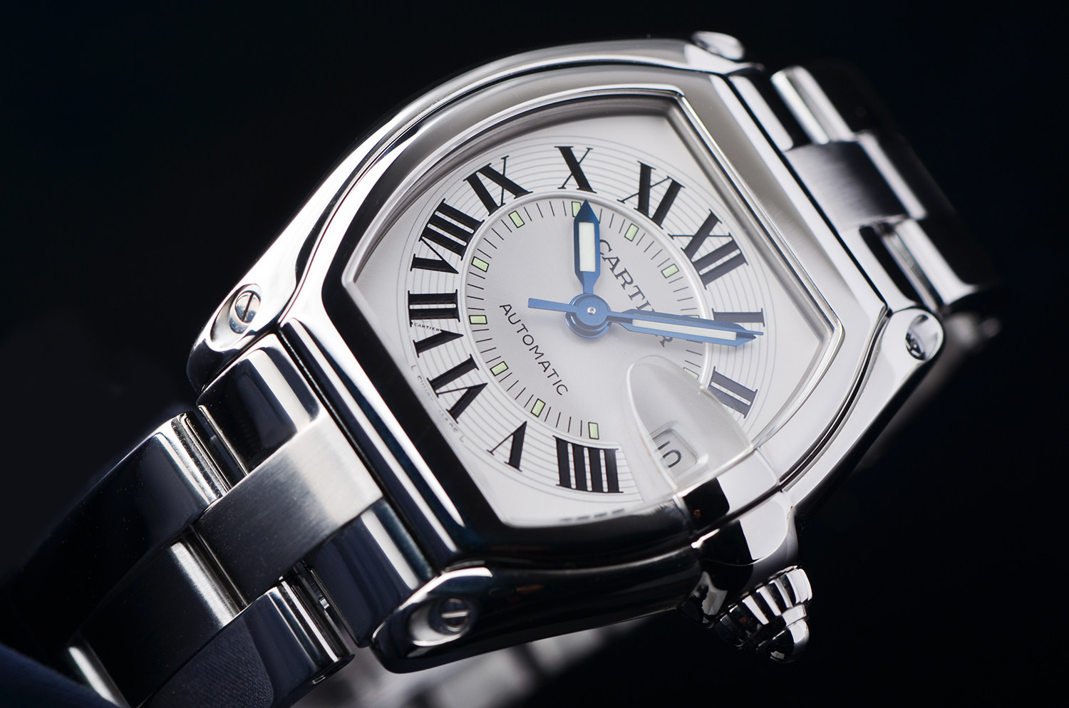 银灰双色表盘搭配标志性的罗马数字与蓝钢指针,延续卡地亚一贯的优雅基因;3点位放大镜日期窗不仅实用,也成为Roadster系列最具标志性的设计之一。