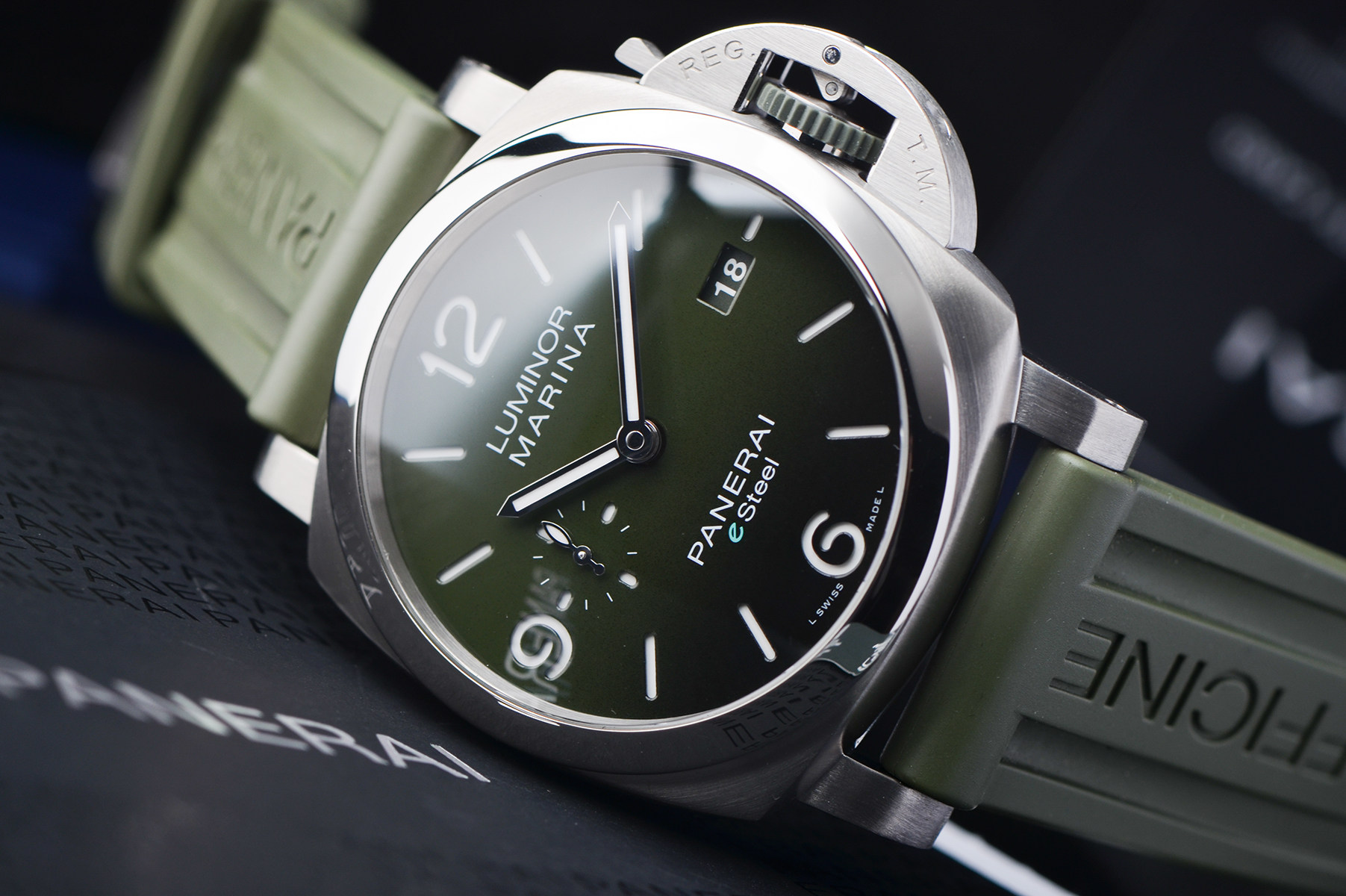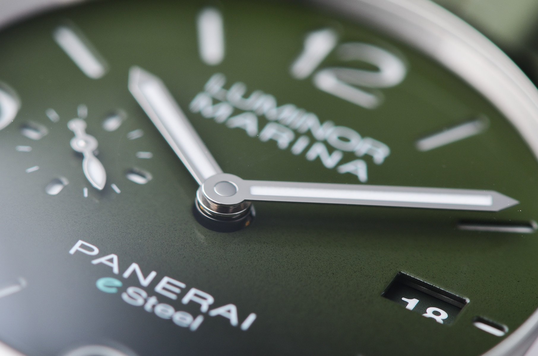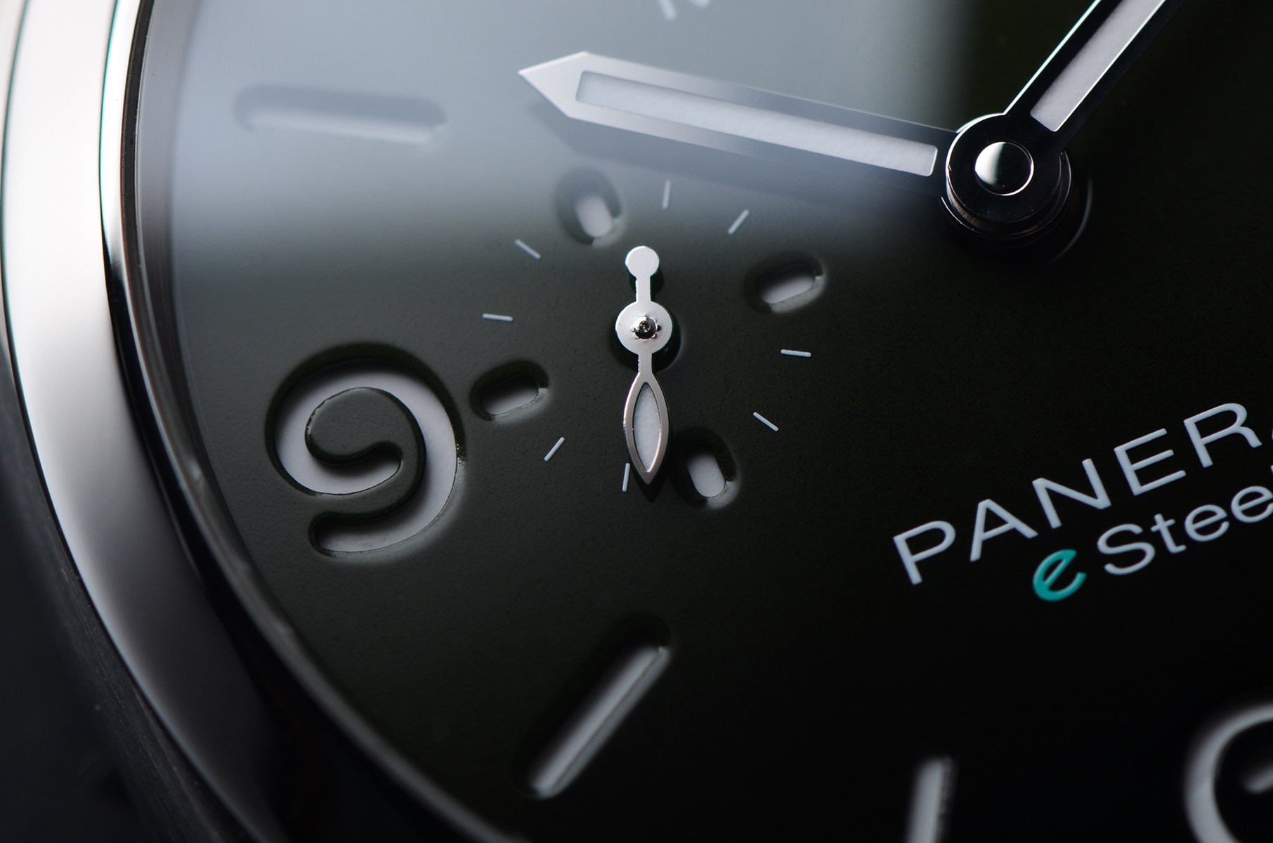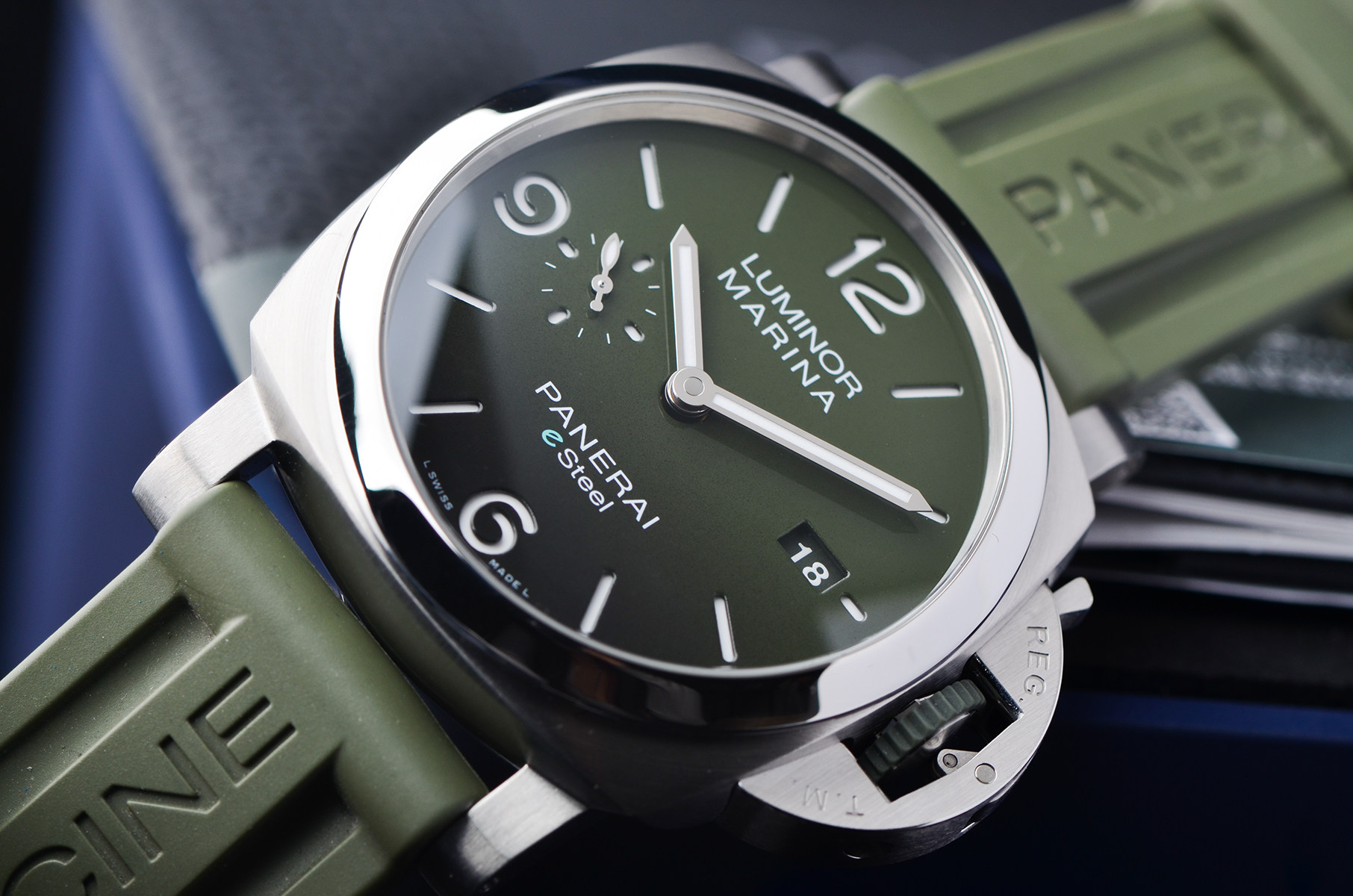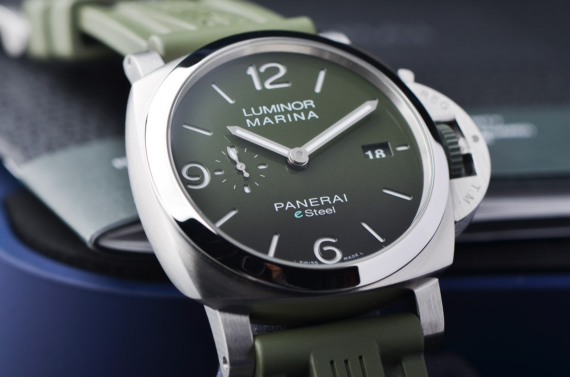 这一枚 PAM01356,采用沛纳海近年重点推出的 eSteel™ 环保材质——