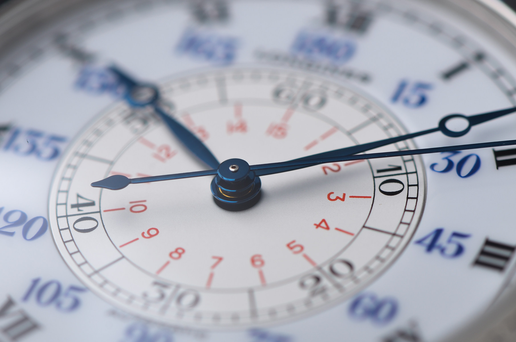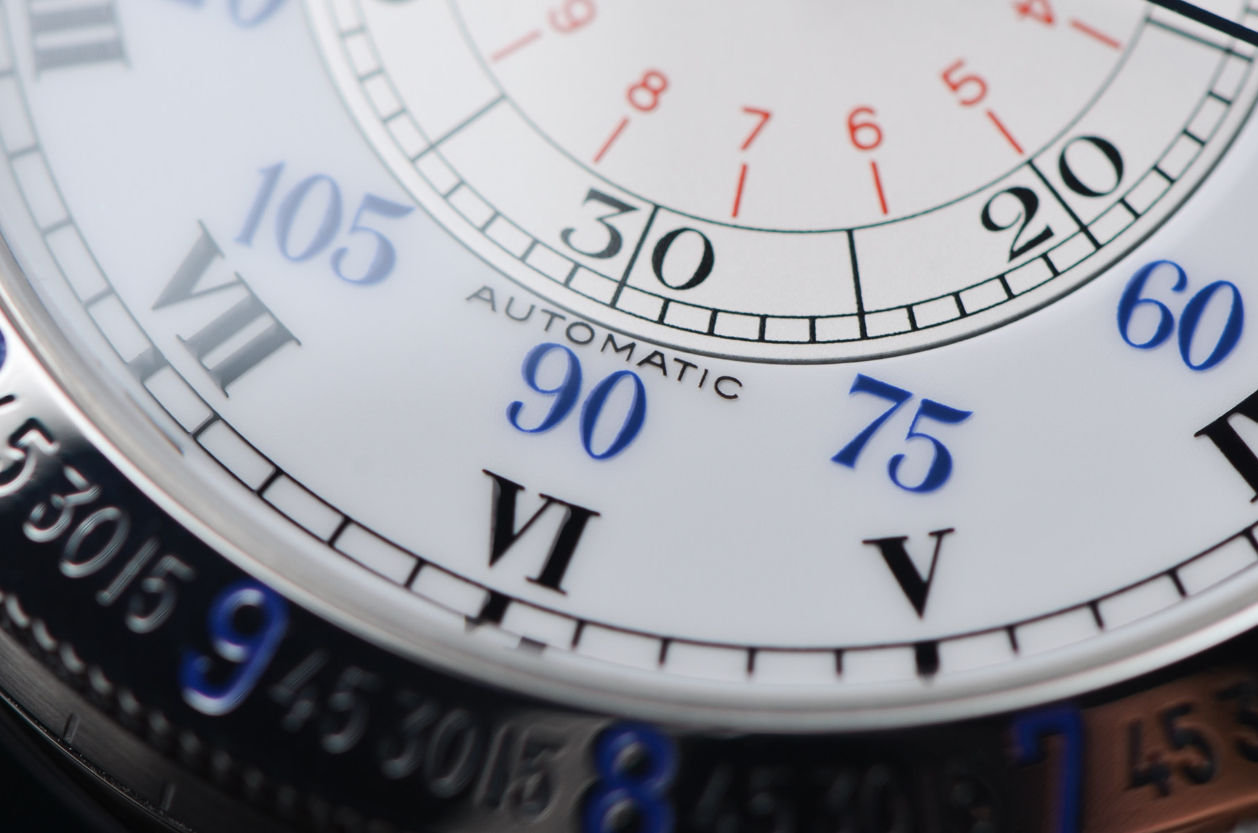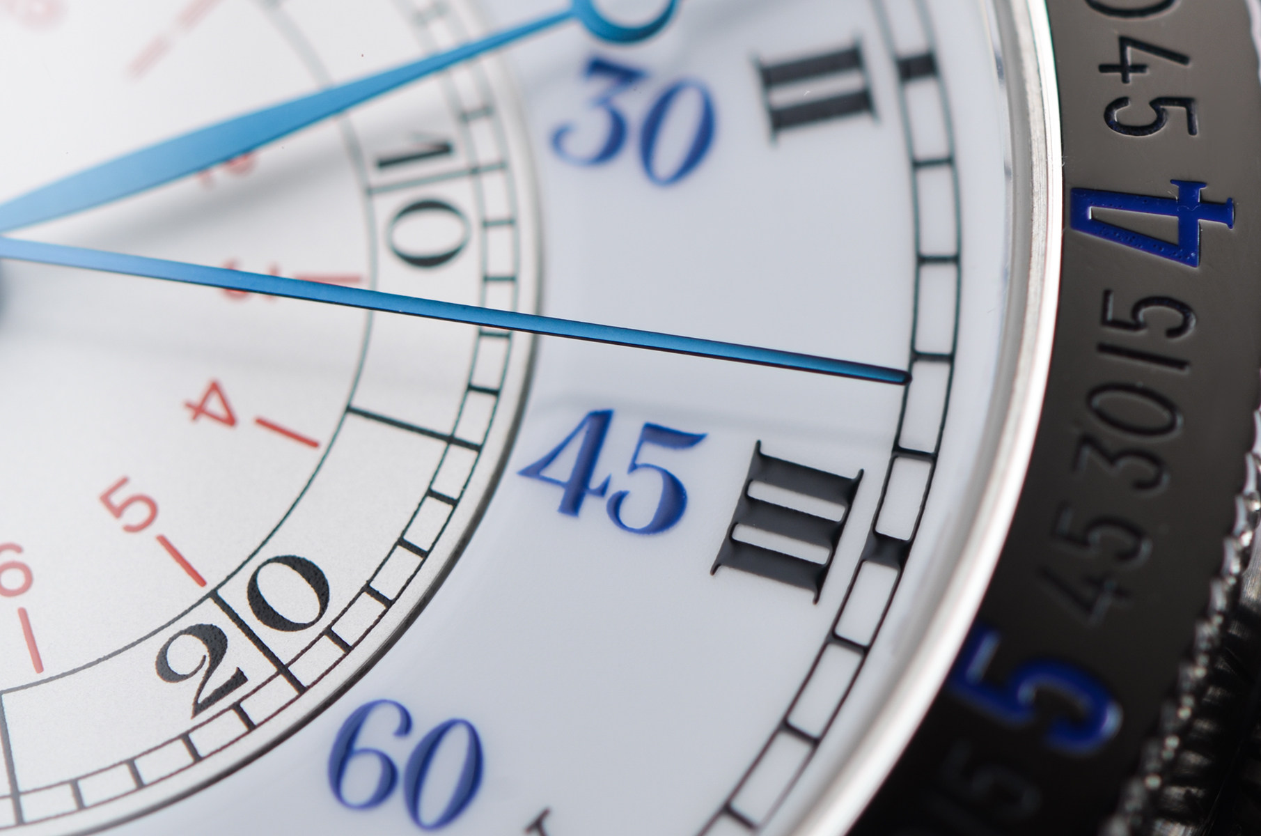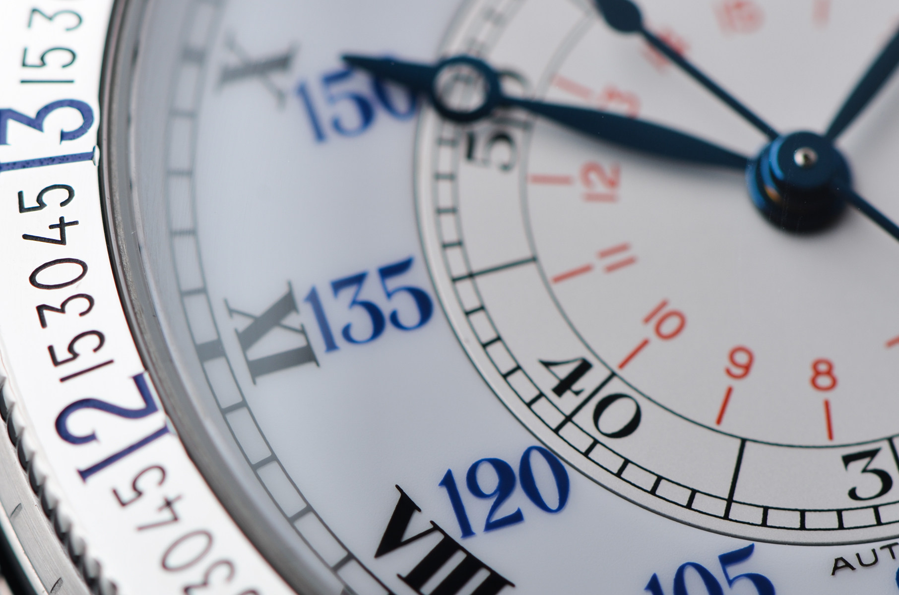 47.5mm大尺寸表壳,气场十足,佩戴在腕间几乎不可能被忽视。银白双层结构表盘,罗马数字、分钟刻度与外圈角度刻度层层递进,复杂却极具秩序感。蓝钢指针在光线下闪烁,复古气息拉满。