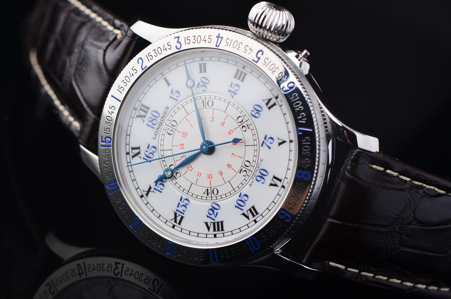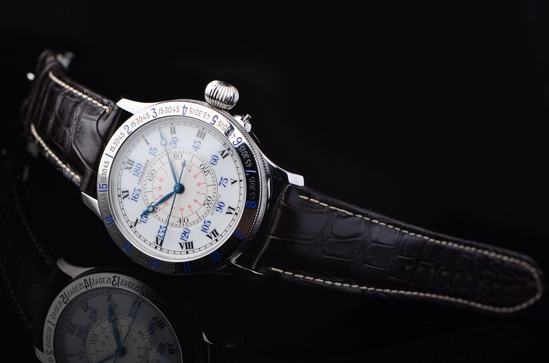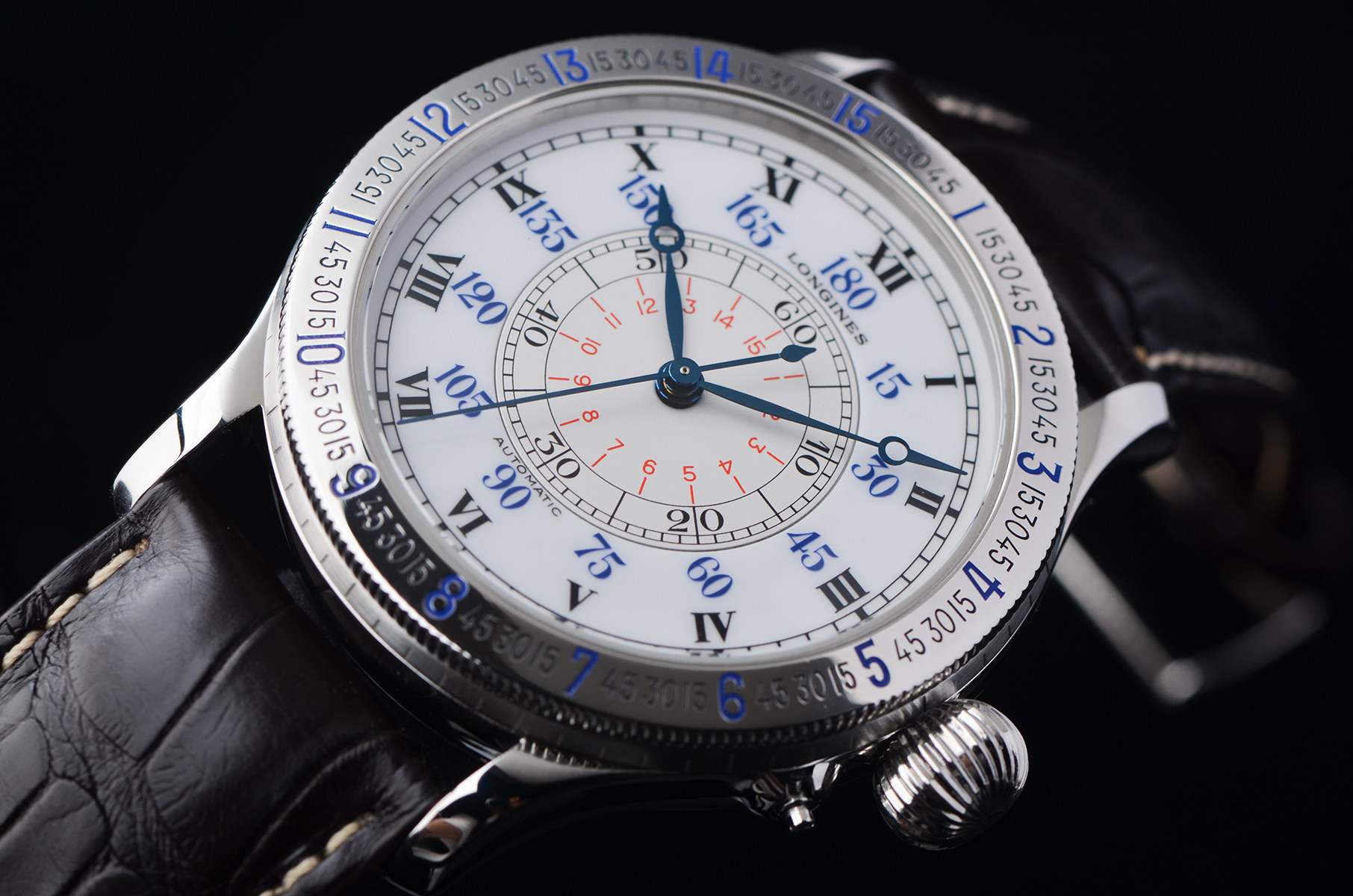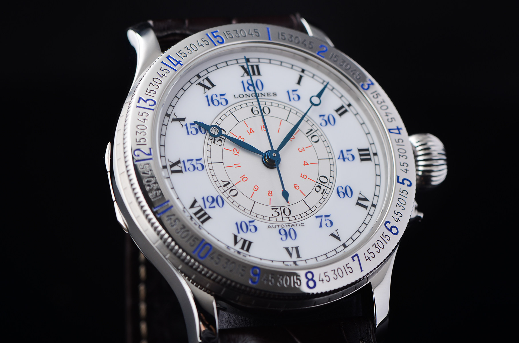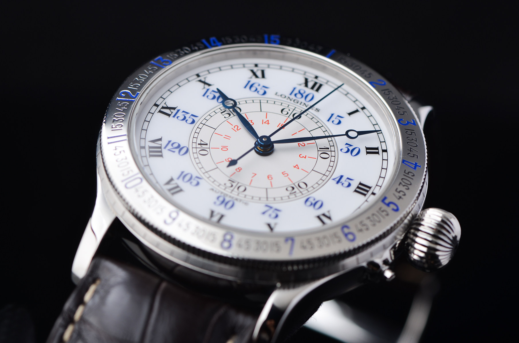 在完成人类首次单人不间断横跨大西洋飞行后,与浪琴共同打造的“时角腕表”。